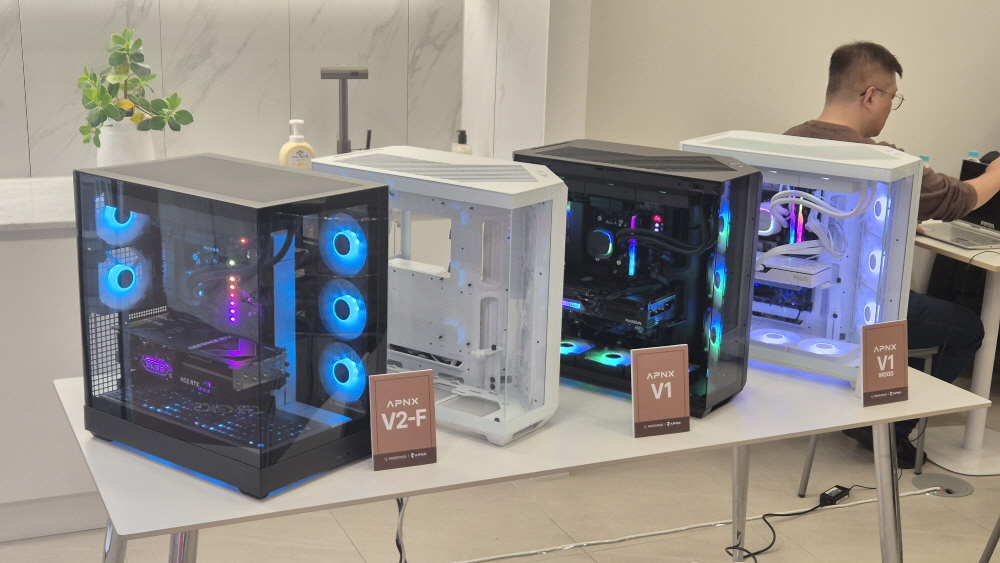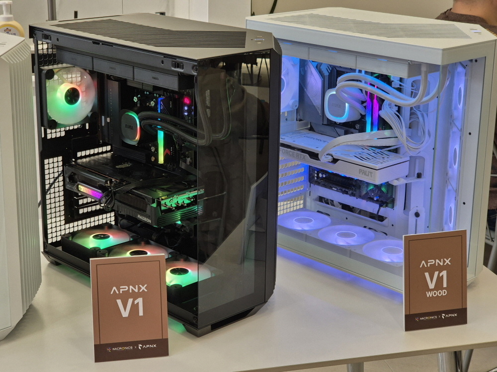 마이크로닉스는 글로벌 브랜드 APNX의 신제품 ‘APNX V1’을 공개했다. V1은 전면과 측면을 연결하는 파노라믹 강화유리와 45도 각도 패널을 적용해 공기 흐름을 자연스럽게 유도하면서 개방감을 확보한 것이 특징이다.