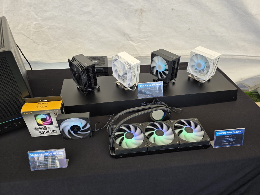마이크로닉스의 공랭 쿨러 ‘ICEROCK MA-500 ARGB’도 함께 전시됐다. TDP 220W를 지원하는 고성능 공랭 쿨러로, HDT 구조와 120mm aRGB 팬을 적용해 성능과 디자인을 동시에 강조한 제품이다.
