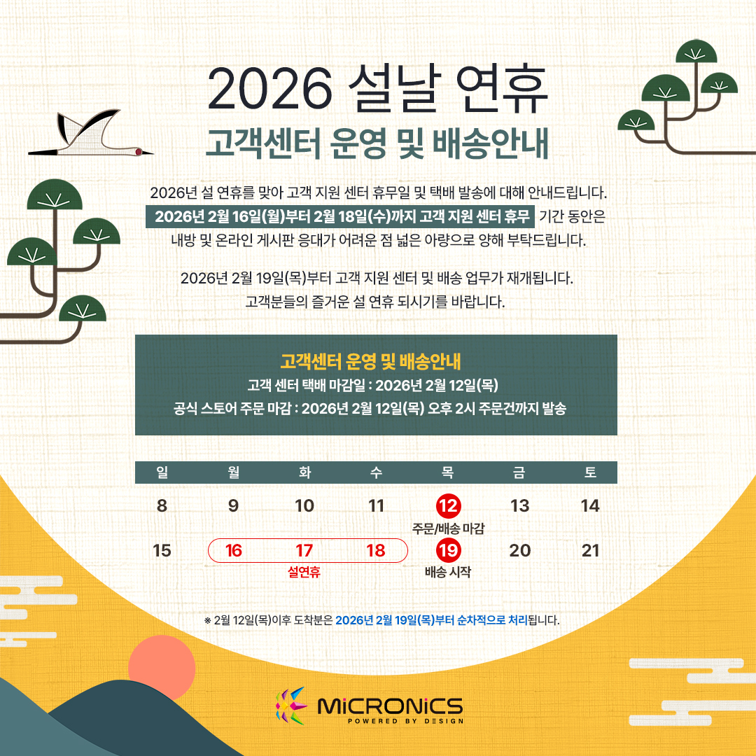 2026년 2월 19일(목)부터 고객 지원 센터 및 배송 업무가 재개됩니다.