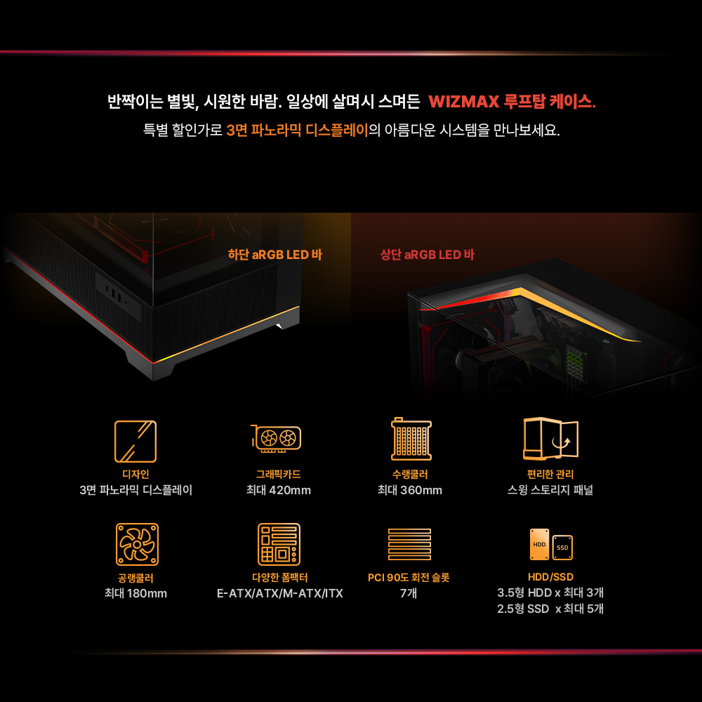 루프탑은 상단·전면·측면에 강화유리를 적용한 3면 파노라믹 구조로 내부 하드웨어와 RGB 조명을 입체감 있게 드러낸다. 상·하단에 배치된 aRGB LED 바는 외관과 자연스럽게 어우러져 밝고 정돈된 이미지를 완성한다.