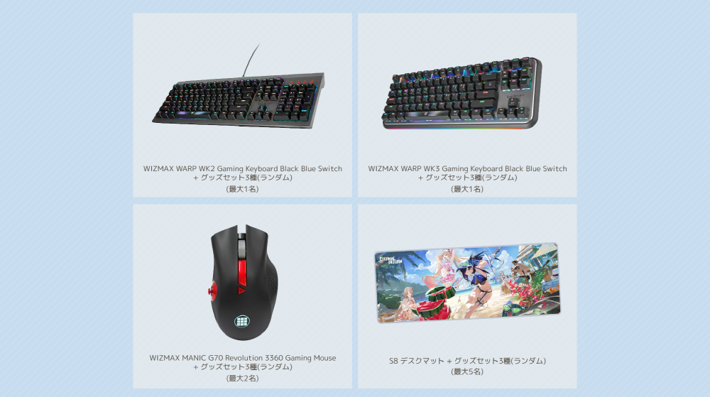 3위는 6만 엔에 위즈맥스 워프 WK2 게이밍 키보드가 주어지며, 4위는 약 4만 엔 상당의 위즈맥스 MANIC G70 Revolution 3360 게이밍 마우스를 받게 된다.