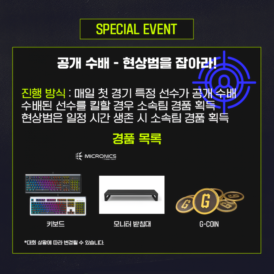 이 이벤트는 매일 첫 경기에서 특정 선수를 ‘현상범’으로 지정하는 방식으로 진행된다. 해당 선수를 킬한 팀에게는 마이크로닉스 게이밍 키보드, UV-M100 살균 모니터 받침대, G-COIN 등 다양한 경품이 제공되며, 반대로 현상범이 일정 시간 생존에 성공할 경우 현상범 소속팀이 동일한 경품을 획득한다.