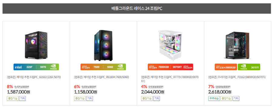 대표 구성은 인텔 코어 울트라5 224F + RTX 5070, AMD 라이젠5 7600 + RTX 5060, 라이젠7 7800X3D + 라데온 RX 9070 XT, 라이젠9 9800X3D + RTX 5070 Ti 등으로 구성돼, 성능과 가격의 균형을 모두 갖췄다.