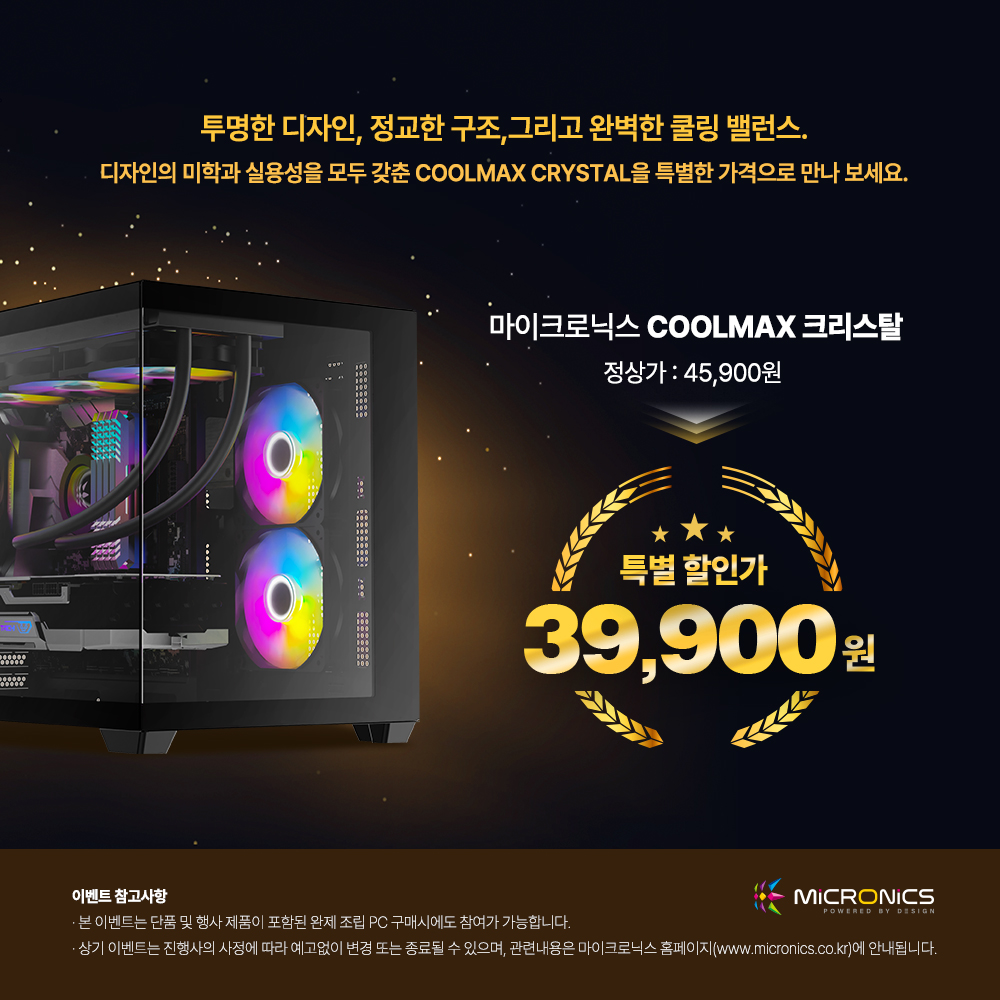 [2025년 11월 10일] 게이밍 기기 디자인·개발·제조 전문기업 한미마이크로닉스(대표: 강현민, 이하 마이크로닉스)가 파노라믹 디스플레이 PC 케이스 ‘COOLMAX 크리스탈(쿨맥스 크리스탈)’의 한정수량 특가 행사를 진행한다.