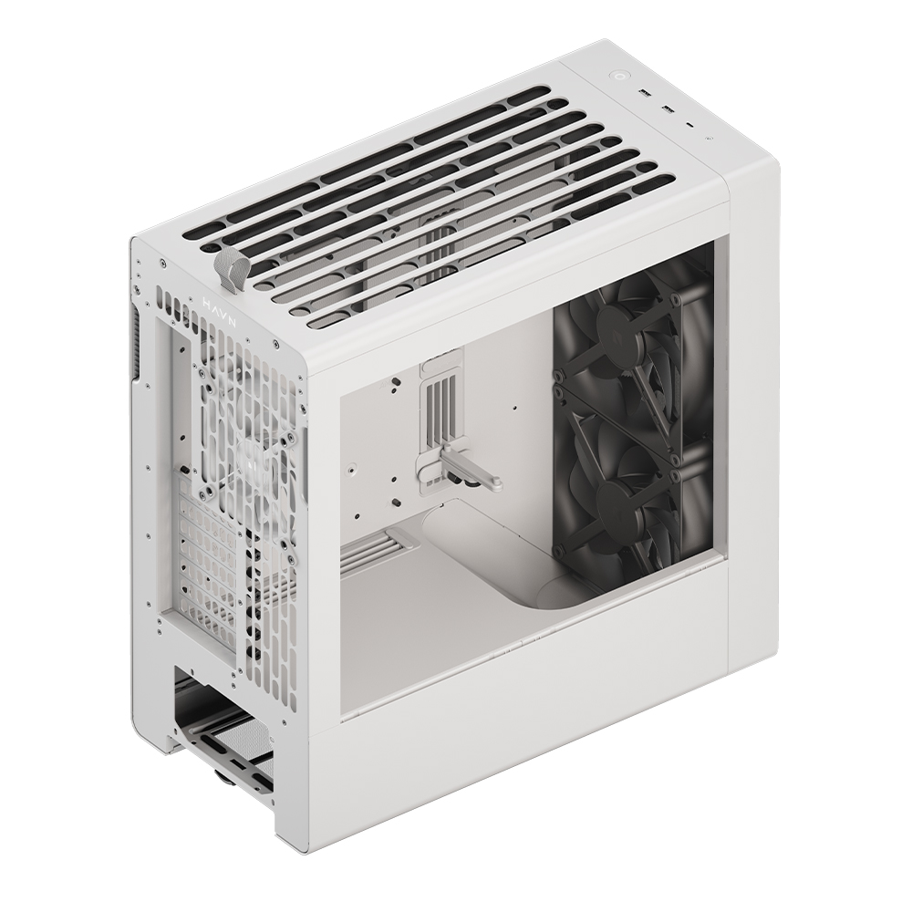 전면 180mm HAVN H18 퍼포먼스 팬은 높은 풍압과 정숙성을 동시에 확보한 점이 특징이다. FDB 베어링과 진동 차단 설계를 적용해 소음을 줄였으며, 고래 지느러미를 닮은 하모나이즈드 블레이드 엣지가 난류를 최소화해 풍량 효율을 높인다. 하모나이즈드 플로우 허브는 공기를 블레이드 방향으로 정확히 유도해 GPU 주변으로 안정적인 냉각 공기를 공급한다.
