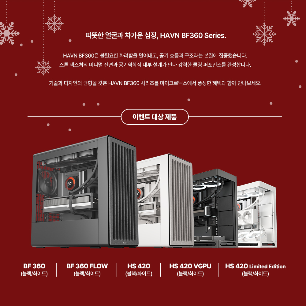 마이크로닉스는 출시를 기념해 HAVN 시리즈 대상 프로모션을 진행한다. 2025년 11월 26일부터 12월 25일까지 BF 360, BF 360 Flow, HS 420, HS 420 VGPU, HS 420 Limited Edition 구매 후 응모 시 네이버페이 1만 원 교환권이 1:1로 증정된다. 또한 포토 상품평 작성 후 응모할 경우 EZDIY-FAB SHILED ATX 24핀 ARGB 90도 어댑터(블랙)가 추가 제공된다.