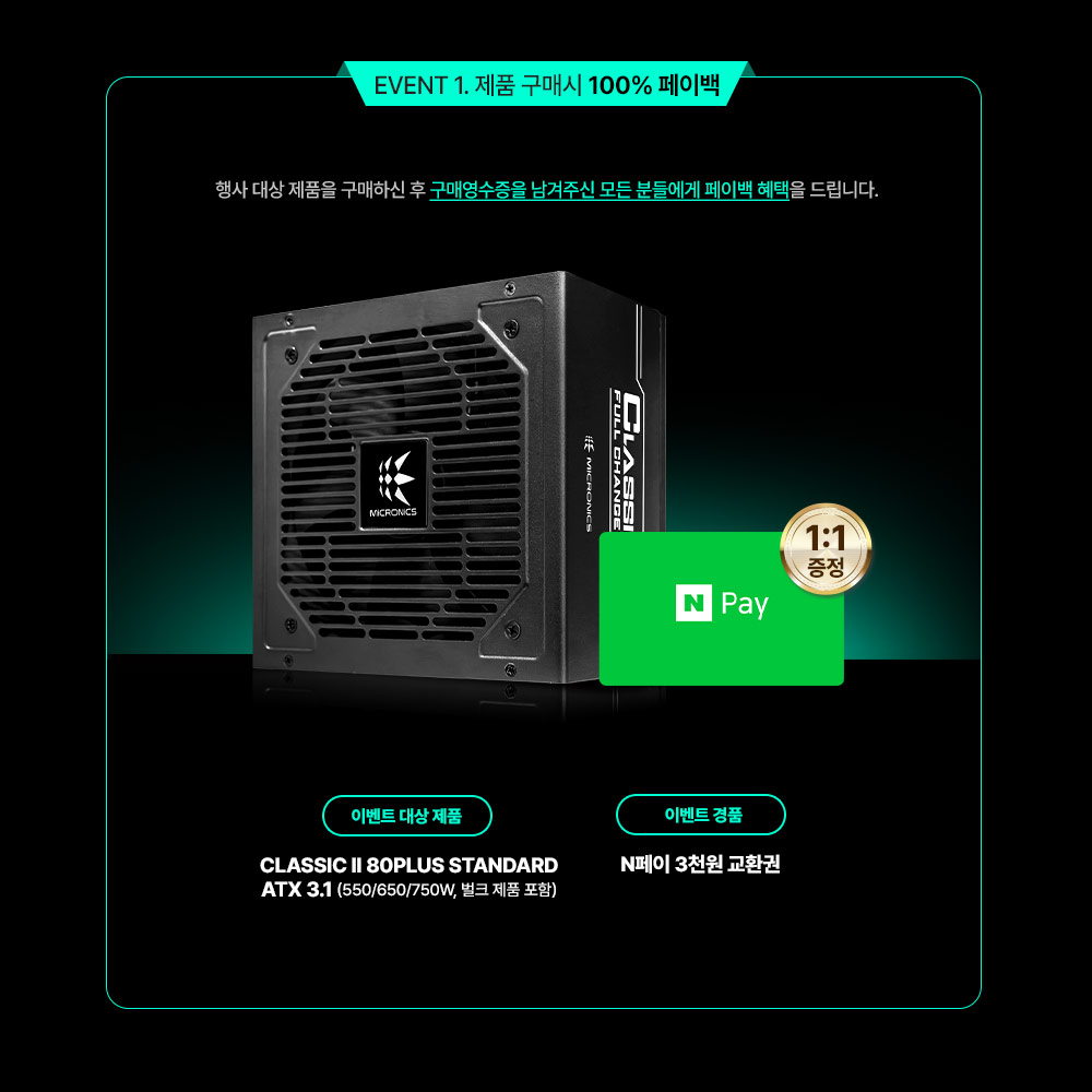 행사 기간 동안 클래식 II 80PLUS STANDARD ATX 3.1(550W·650W·750W) 구매 고객 전원에게 네이버페이 3,000원 교환권이 1:1로 지급된다. 또한 페이백 이벤트 참여자 중 추첨을 통해 20명에게 ‘메가커피 핫 아메리카노’ 기프티콘이 추가 제공된다.
