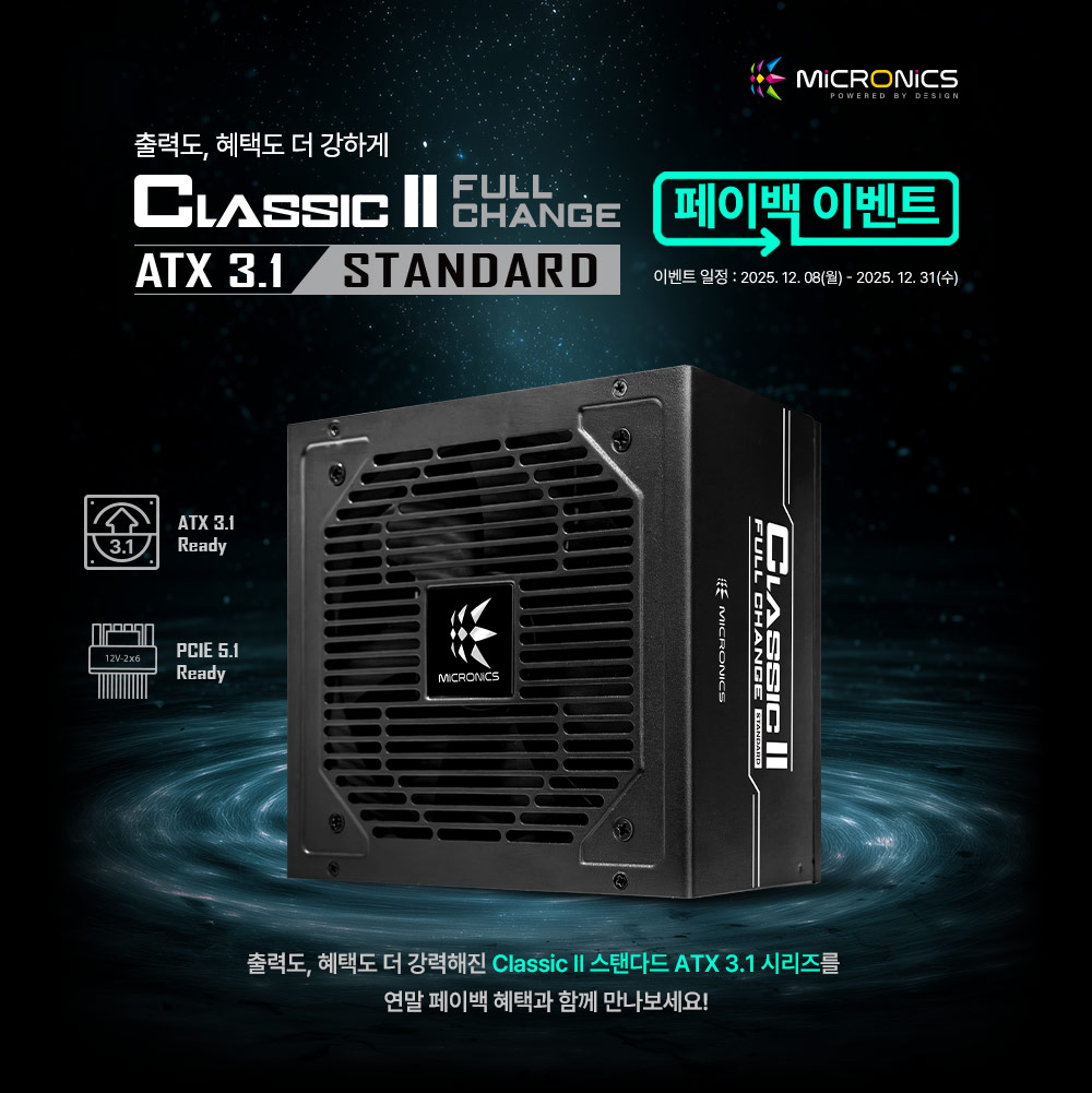 [2025년 12월 08일] 게이밍 기기 디자인·개발·제조 전문기업 한미마이크로닉스(대표: 강현민, 이하 마이크로닉스)가 연말을 맞아 클래식 II 풀체인지 80PLUS STANDARD ATX 3.1 시리즈 구매자를 대상으로 한 페이백 이벤트를 진행한다.