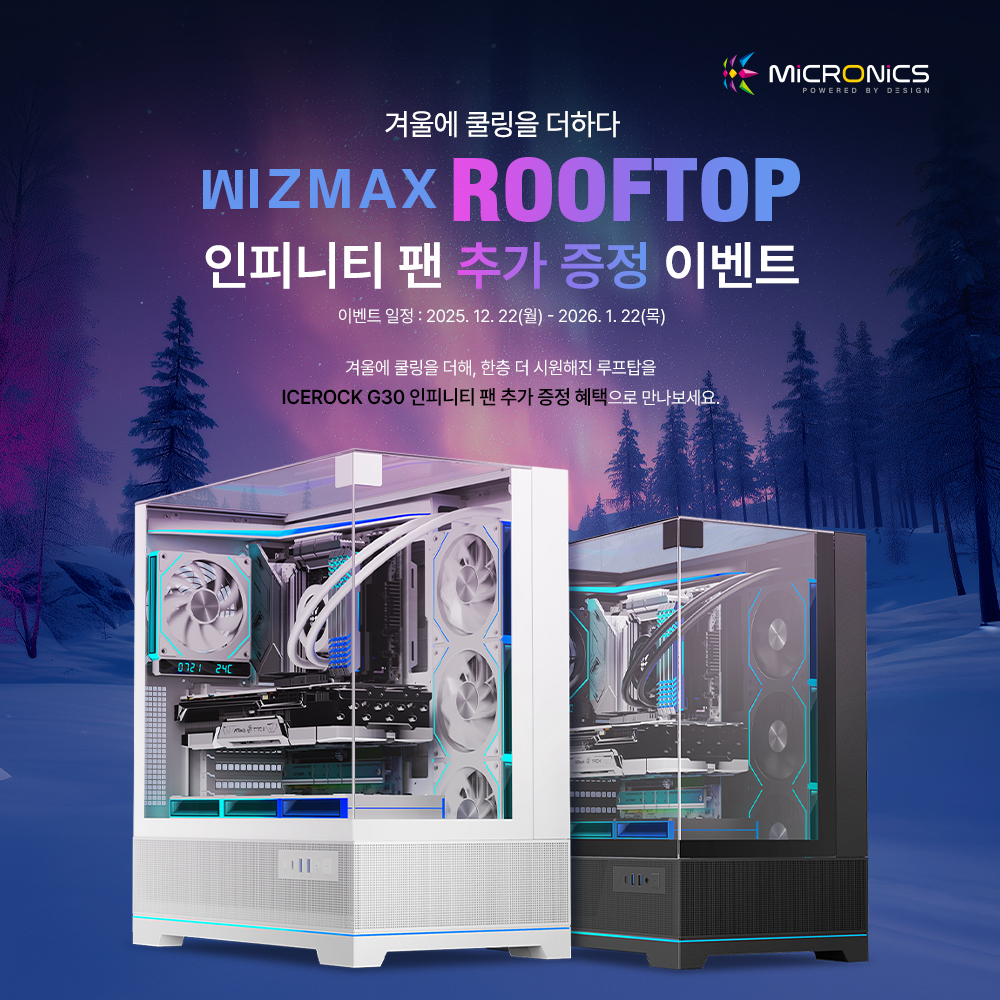 [2025년 12월 22일] 게이밍 기기 디자인·개발·제조 전문기업 한미마이크로닉스(대표 강현민, 이하 마이크로닉스)가 프리미엄 PC 케이스 WIZMAX 루프탑 시리즈 구매 고객을 대상으로 인피니티 팬 증정 이벤트를 진행한다.