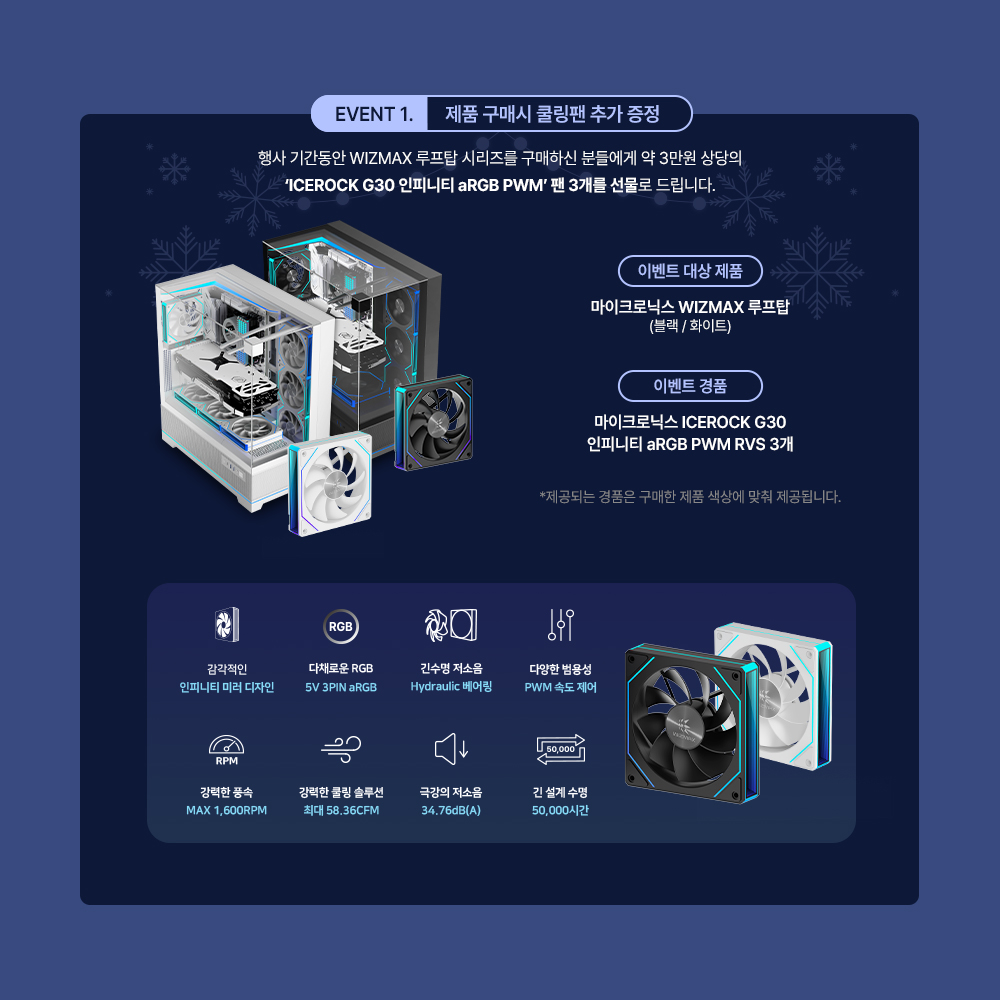 이벤트 기간 중 WIZMAX 루프탑 시리즈를 구매하면 약 3만 원 상당의 아이스락 G30 인피니티 aRGB PWM RVS 팬 3개가 추가로 제공된다. 여기에 행사 기간 내 구매 쇼핑몰에 포토 상품평을 작성한 고객을 대상으로 추첨을 통해 총 5명에게 베스킨라빈스 기프티콘을 지급한다.