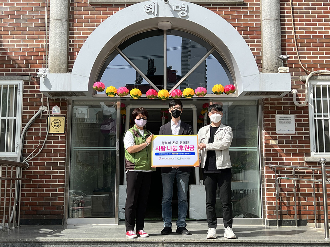 ▲ 마이크로닉스가 혜명보육원을 찾아 후원금을 전달했다.