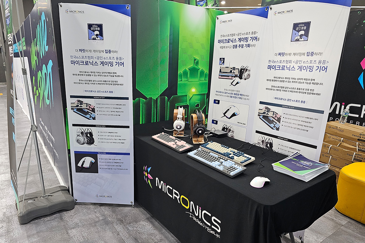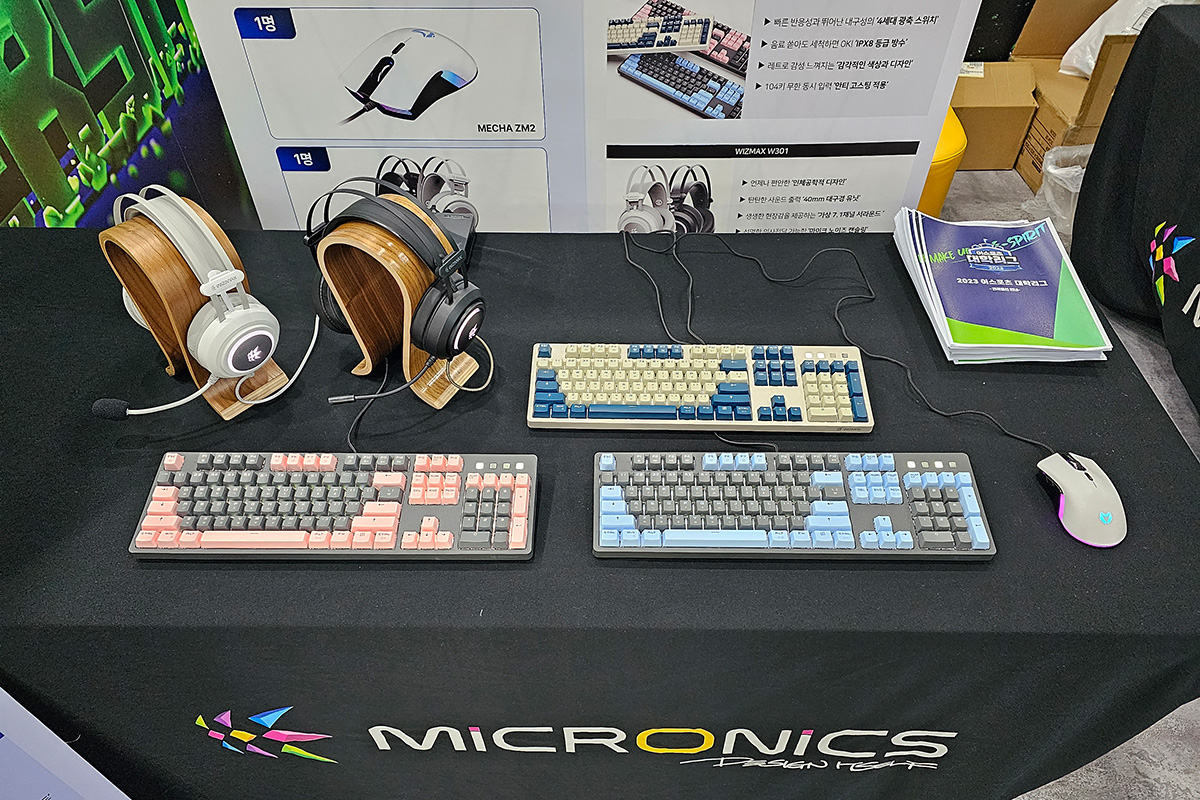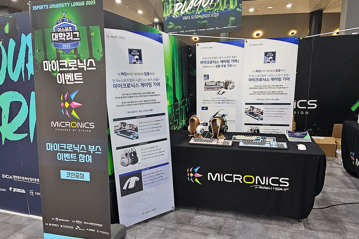 게이밍 기기 디자인·개발·제조 전문기업 한미마이크로닉스(대표: 강현민, 이하 마이크로닉스)는 대전 이스포츠 경기장, 드림 아레나에서 개최된 ‘2023 이스포츠 대학리그’ 결선에 부스를 마련하고 이스포츠 선수와 관계자에게 ‘공인 e스포츠 용품’에 선정된 게이밍 기어들을 소개했다.