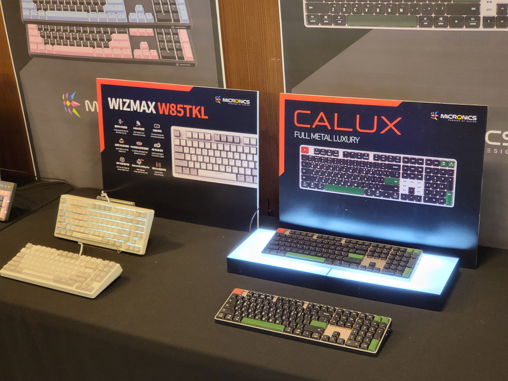 마이크로닉스는 고급스러운 기계식 키보드를 표방하는 ‘칼럭스(CALUX)’를 선보였다. 칼럭스는 본체를 정밀 가공한 알루미늄으로 구성해 고급스럽고 내구성이 뛰어나다. 체리 로우 프로파일, 게이트론 로우 프로파일 스위치와 낮은 높이의 키캡으로 장시간 타건 시 손목에 부담이 덜 가며 화이트 LED로 감각적이다. 키캡의 색상도 다양하게 조합해 사용자 개인 취향을 반영할 수 있도록 지원할 예정이며, 맥 운영체제 사용자에 맞춰 윈도우와 맥OS 간 전환도 할 수 있다.