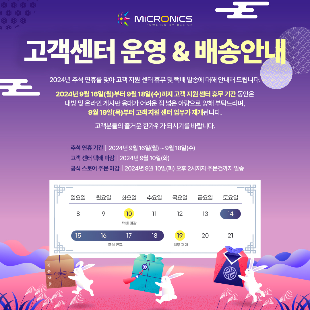 2024년 추석 연휴를 맞아 고객 지원 센터 휴무 및 택배 발송에 대해 안내해 드립니다.