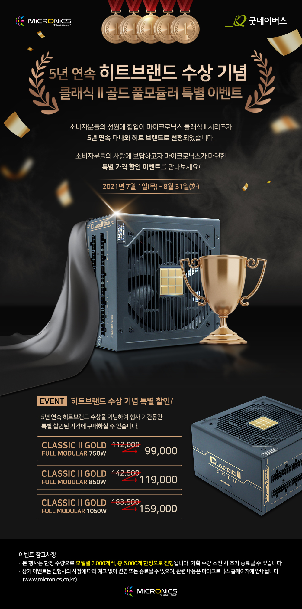 게이밍 기기 디자인·개발·제조 전문기업 한미마이크로닉스(대표: 강현민, 이하 마이크로닉스)는 자사의 베스트셀러 파워서플라이 제품군인 ‘클래식 II 시리즈’의 5년 연속 다나와 히트브랜드 수상을 기념, 자사 고성능 파워서플라이 제품군인 ‘클래식 II 골드 풀모듈러’ 가격을 할인하는 특별 이벤트를 7월 1일부터 8월 31일까지 실시한다.