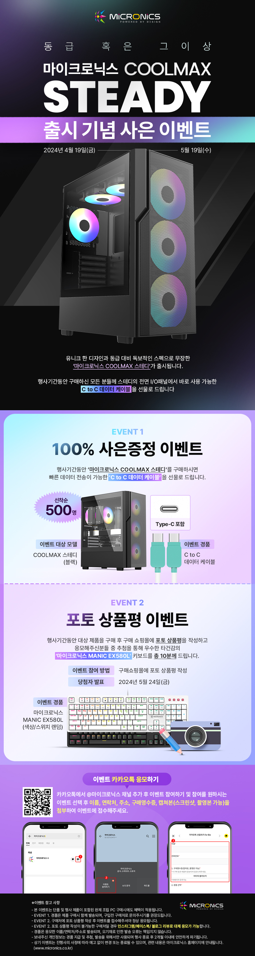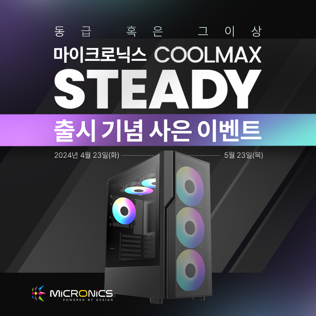 게이밍 기기 디자인·개발·제조 전문기업 한미마이크로닉스(대표: 강현민, 이하 마이크로닉스)는 메쉬 디자인에 강력한 쿨링팬 구성의 ‘COOLMAX STEADY(쿨맥스 스테디)’의 사은 이벤트를 진행한다.