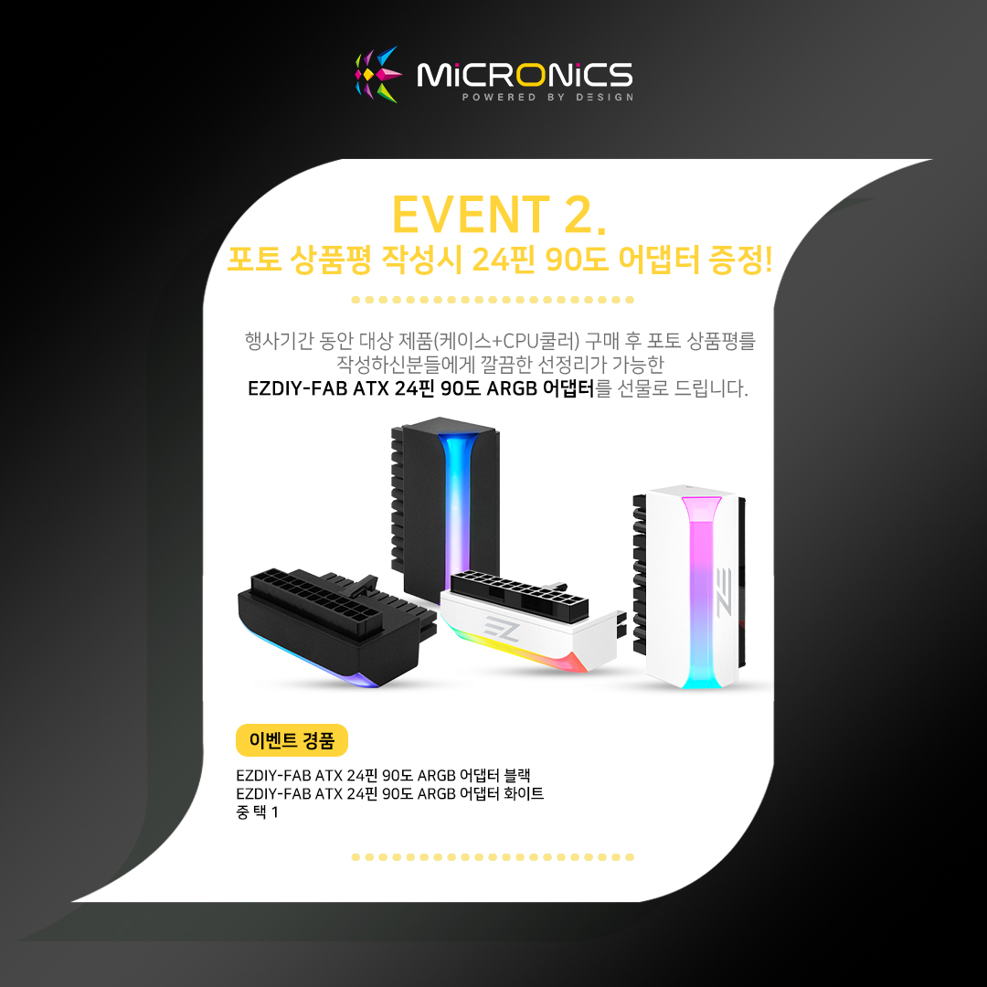 포토 상품평 행사도 함께 진행된다. 구매 후 포토 상품평 작성 시 깔끔한 선정리를 돕는 EZDIY-FAB ATX 24핀 90도 ARGB 어댑터(블랙, 화이트)가 증정된다.
