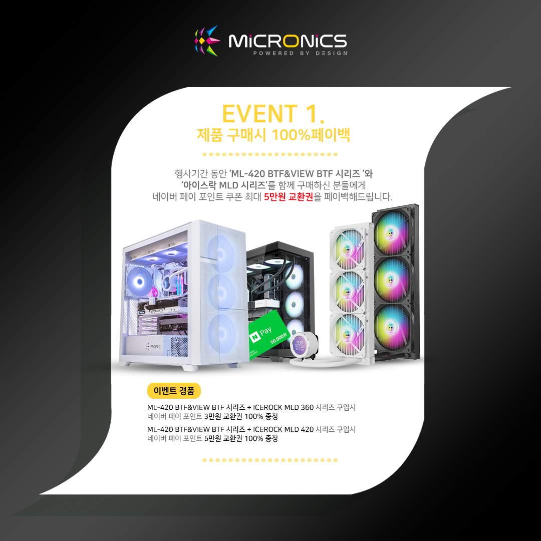 게이밍 기기 디자인·개발·제조 전문기업 한미마이크로닉스(대표: 강현민, 이하 마이크로닉스)는 BTF 메인보드를 장착할 수 있는 빅타워 케이스 ‘ML-420 BTF’ 시리즈와 일체형 수랭쿨러 ICEROCK MLD(아이스락 MLD) 시리즈의 페이백 행사를 진행한다.