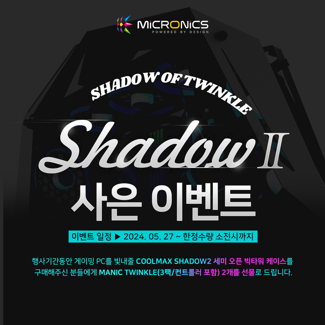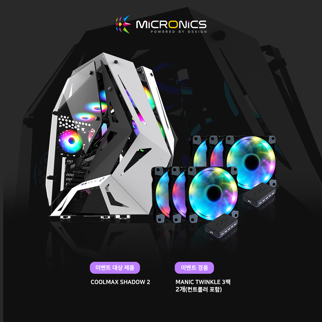 게이밍 기기 디자인·개발·제조 전문기업 한미마이크로닉스(대표: 강현민, 이하 마이크로닉스)는 세미 오픈 PC 케이스 COOLMAX SHADOW2(쿨맥스 쉐도우2)의 사은 행사를 진행한다.