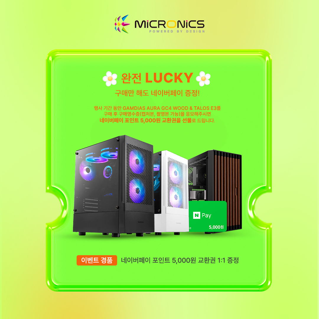 또한, 마이크로닉스는 아우라 GC4 우드와 겜디아스 탈로스 E3의 출시를 기념해 사은 행사를 6월 5일부터 7월 7일까지 진행한다. 행사 기간 동안 아우라 GC4 우드와 탈로스 E3를 구매 후 구매영수증을 응모하면 네이버페이 5천 원 교환권이 증정된다. 구매 쇼핑몰에 포토 상품평 작성 시 네이버페이 3천 원 교환권이 추가로 증정된다.