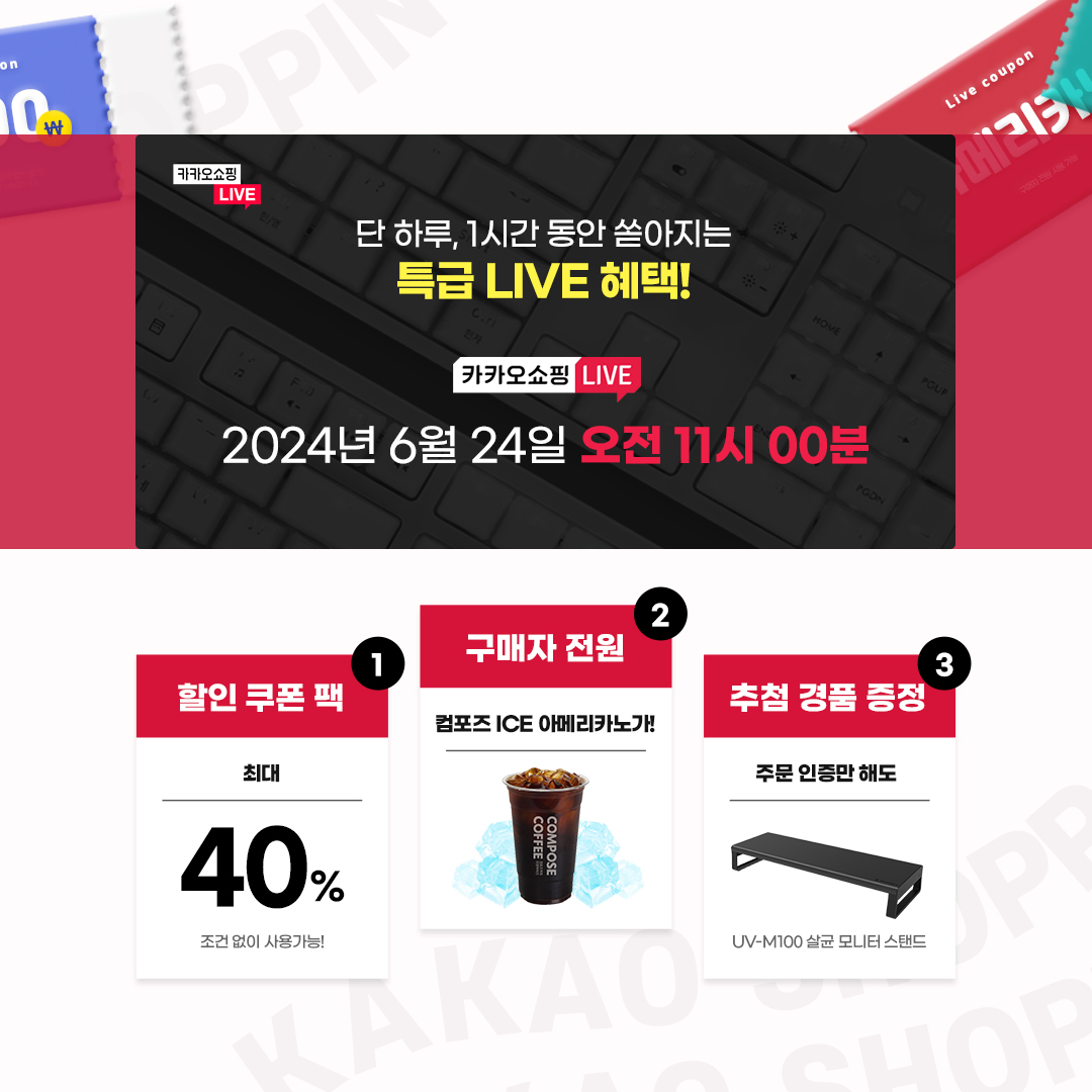 이번 카쇼라 기획전은 6월 24일 오전 11시부터 1시간 동안 진행된다. 행사 시간 동안 기획전 판매 제품 대상으로 최대 40% 할인 쿠폰을 적용할 수 있다. 구매자 전원에게는 컴포즈커피 아이스 아메리카노 쿠폰이 증정되며, 주문 인증 시 추첨을 통해 UV-M100 살균 모니터 스탠드를 증정하는 행사를 진행한다.