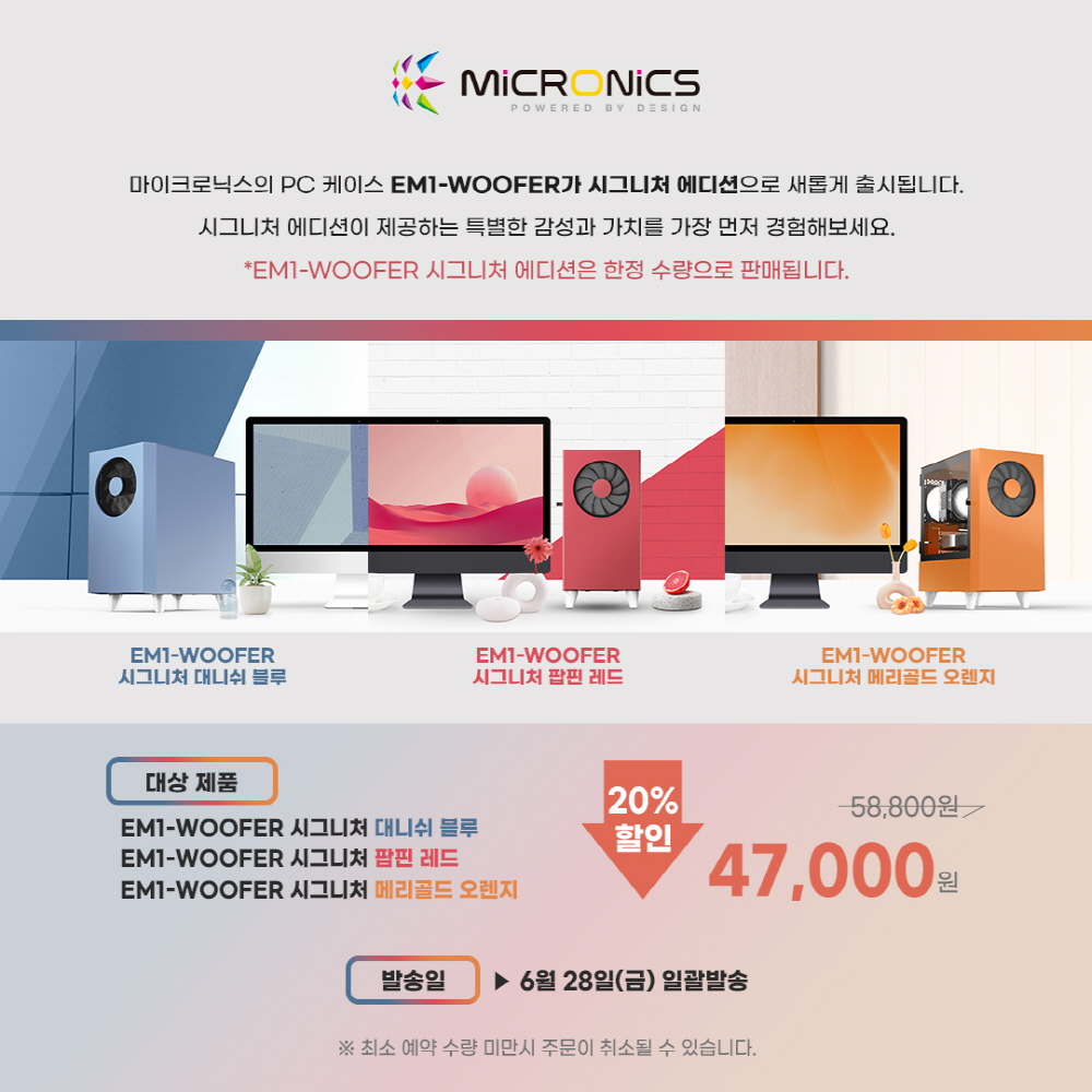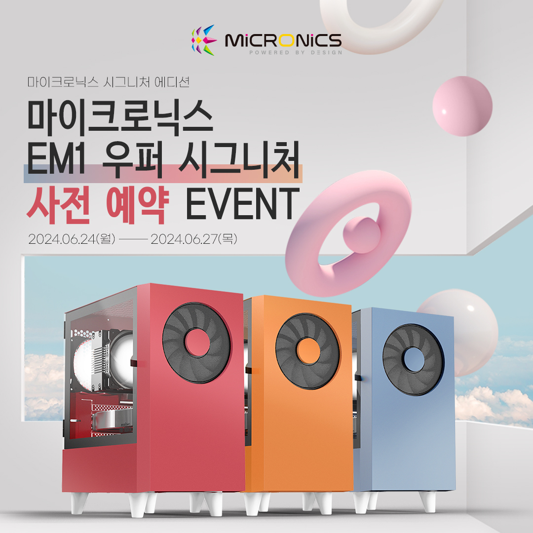 [2024년 6월 24일] 게이밍 기기 디자인·개발·제조 전문기업 한미마이크로닉스(대표: 강현민, 이하 마이크로닉스)는 화려한 컬러의 미니타워 PC 케이스 ‘EM1-Woofer Signature Edition(EM1-우퍼 시그니처 에디션)’을 출시한다.