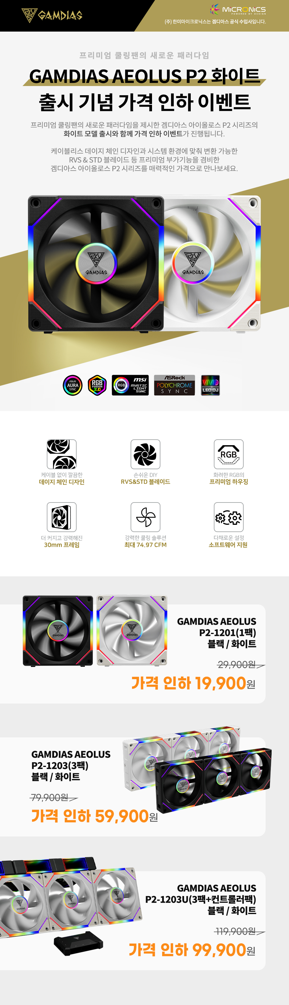 [2024년 8월 9일] 게이밍 기기 디자인·개발·제조 전문기업 한미마이크로닉스(대표: 강현민, 이하 마이크로닉스)는 데이지 체인 디자인에 팬 블레이드를 교체할 수 있는 쿨링팬 ‘GAMDIAS AEOLUS P2 시리즈 화이트(겜디아스 아이올로스 P2 시리즈 화이트, 이하 아이올로스 P2 화이트)를 출시했다.