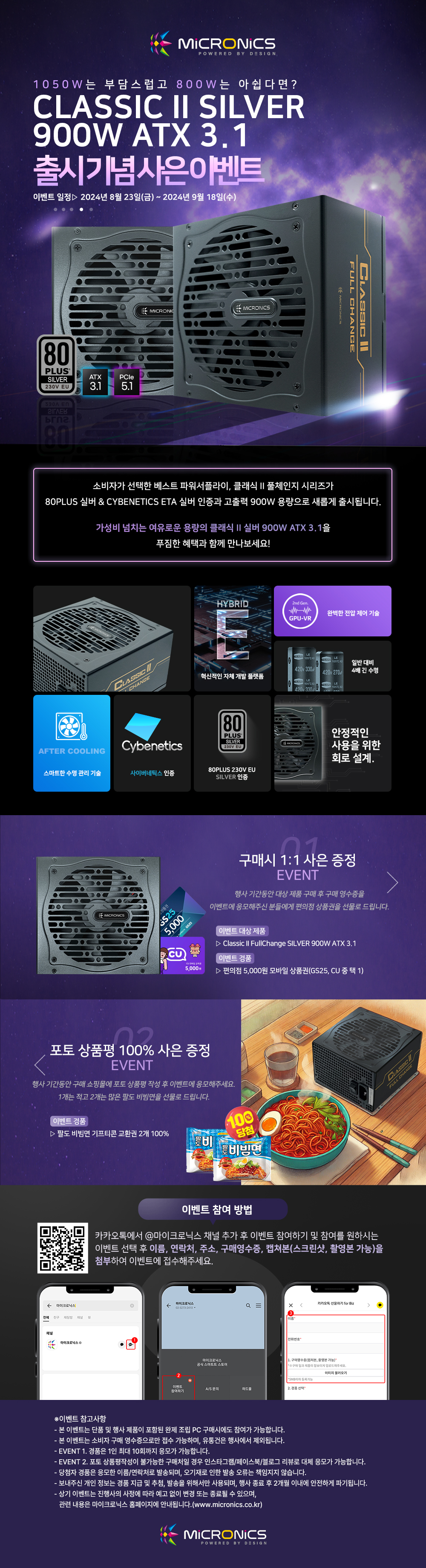 한편, 마이크로닉스는 클래식 II 풀체인지 900W 실버 ATX 3.1 구매 후 영수증 응모 시 편의점 5,000원 모바일 상품권을 증정하는 행사를 진행한다. 포토 상품평 작성 시 비빔면 기프티콘 교환권 2개를 증정하는 행사도 추가로 진행한다.