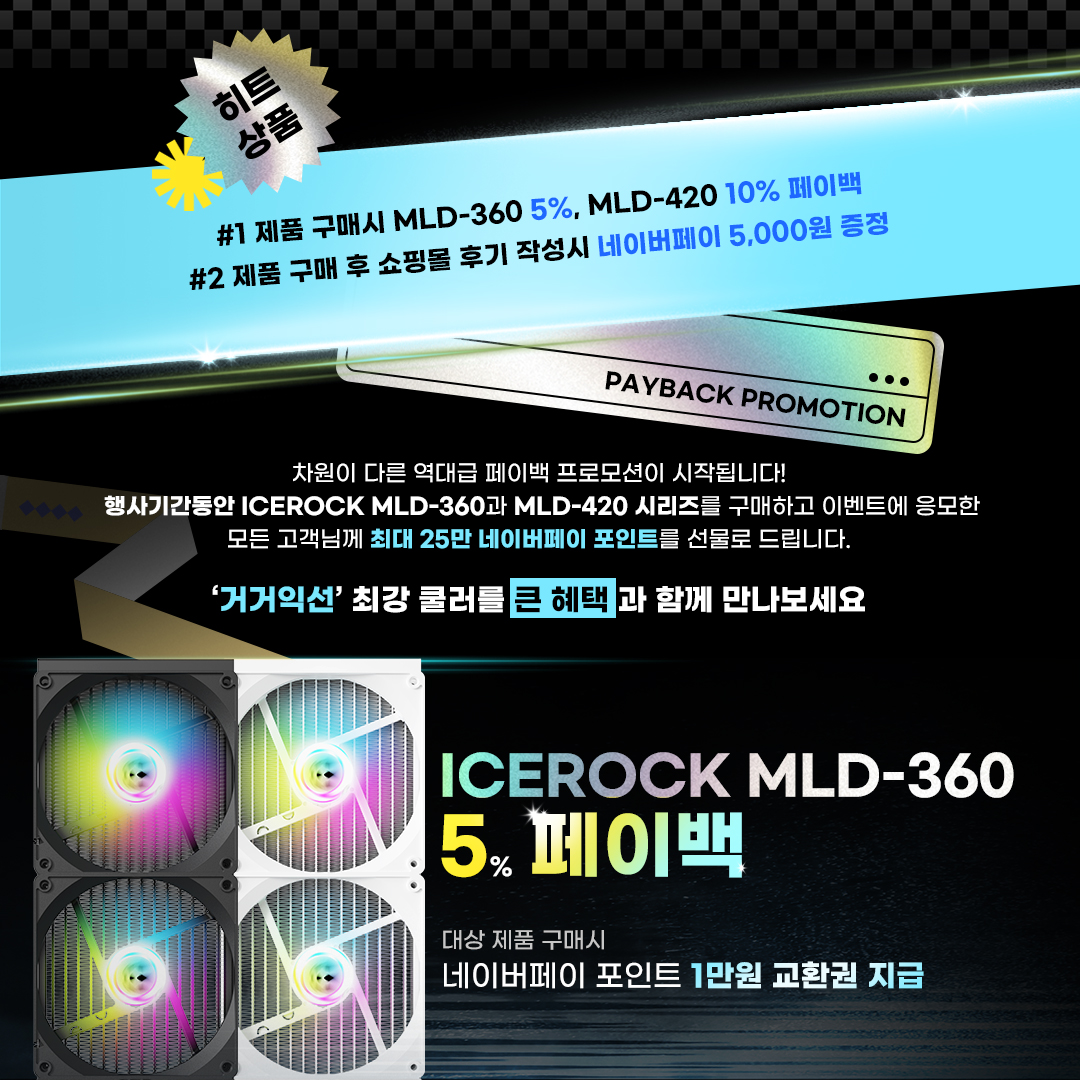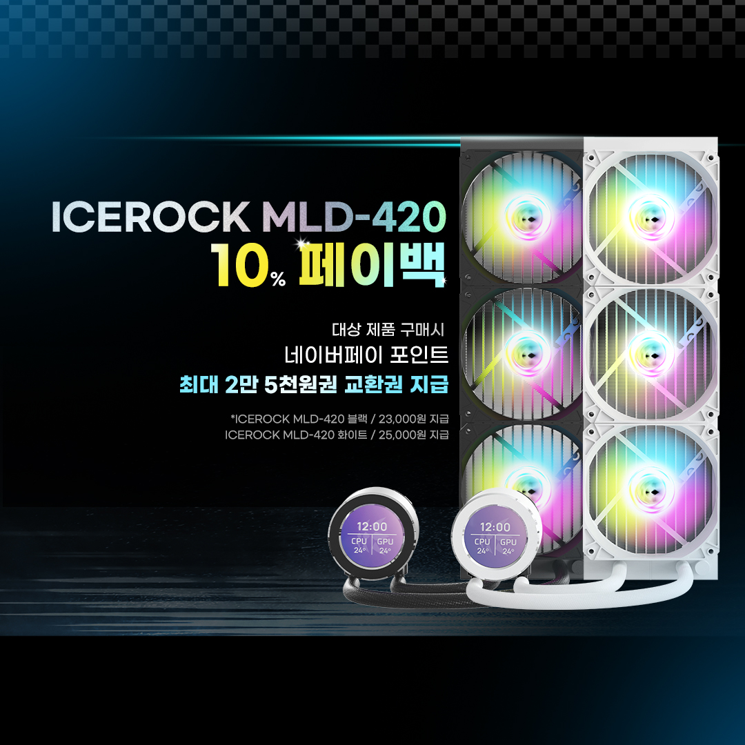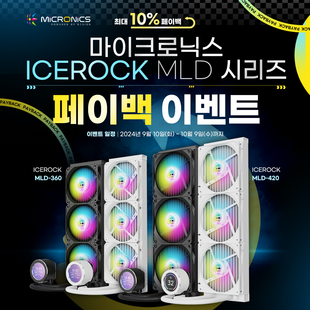 게이밍 기기 디자인·개발·제조 전문기업 한미마이크로닉스(대표: 강현민, 이하 마이크로닉스)는 일체형 수랭쿨러 ‘ICEROCK MLD-420’, ‘ICEROCK MLD-360’(아이스락 MLD-420, 아이스락 MLD-360)의 페이백 행사를 진행한다.