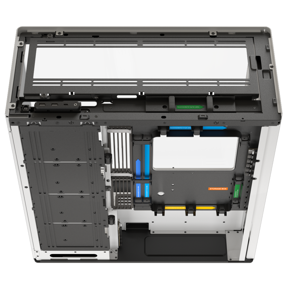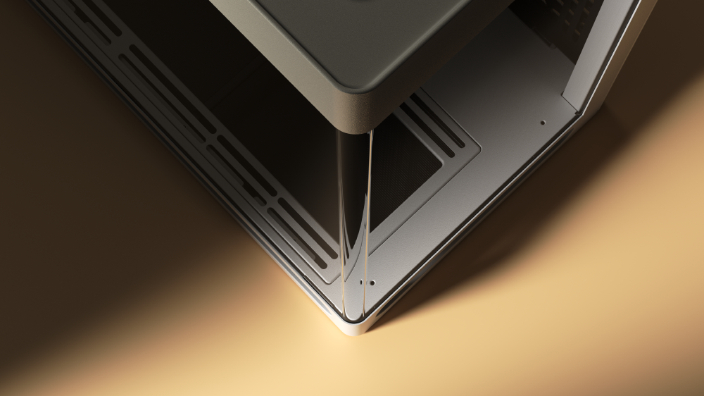 상단 패널은 정밀 가공된 공기 역학적 디자인이며, 독특한 컷아웃 디자인의 받침대는 다양한 표면에서도 통풍 기능을 유지한다. 파워서플라이 슈라우드 디자인 또한 복잡한 3D 스탬핑 공정을 거쳐 난류와 소음을 줄였다. 모든 패널은 자석과 나사로 편리하게 고정되며, 가이드 휠과 레일 시스템 덕분에 조립과 분해 시 부드럽고 직관적인 사용이 가능하다. 팬 브래킷에는 고무 패드가 부착되어 공진음을 방지한다.