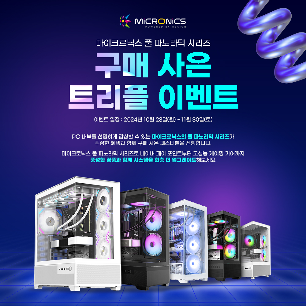 [2024년 10월 28일] 게이밍 기기 디자인·개발·제조 전문기업 한미마이크로닉스(대표: 강현민, 이하 마이크로닉스)는 자사의 PC 케이스 중 풀 파노라믹 시리즈 구매 고객을 대상으로 다양한 혜택을 제공하는 ‘트리플 이벤트’를 진행한다.