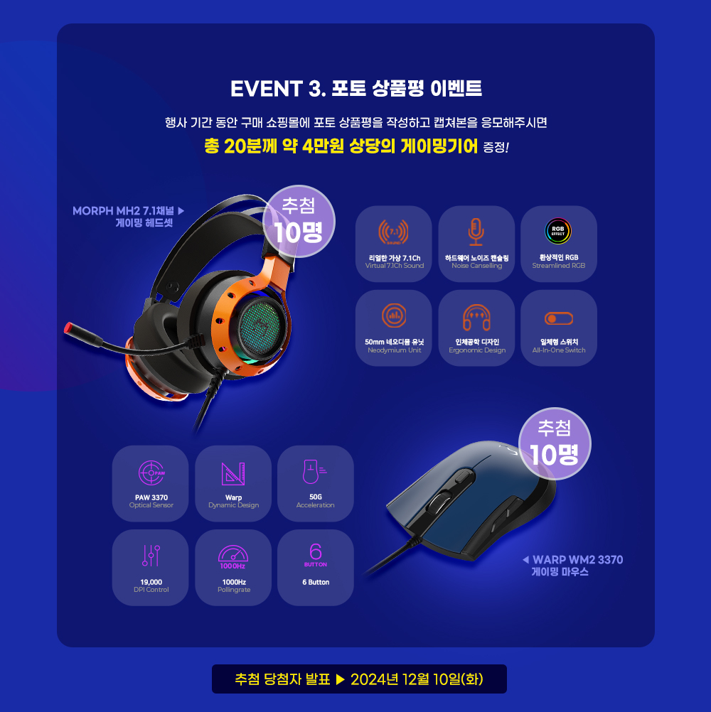 또한, 구매 쇼핑몰에서 포토 상품평을 작성하고 이를 캡쳐해 응모 시 추첨을 통해 MORPH MH2 7.1채널 게이밍 헤드셋 또는 WARP WM2 게이밍 마우스가 증정된다. MORPH MH2는 50mm 네오디뮴 유닛, 하드웨어 노이즈 캔슬링, 가상 7.1채널로 몰입감을 높이고, WARP WM2는 PAW3370 센서를 적용해 최대 가속 50g, 최대 19,000DPI, 1000Hz 폴링레이트로 게임 성능을 강화했다.