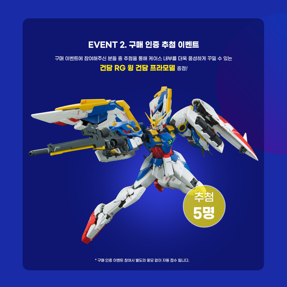 이벤트 기간 중 해당 제품을 구매하고 영수증을 제출하면 네이버 페이 교환권(3천 원에서 최대 1만 원)을 증정하며, 추가로 구매 인증 고객 중 추첨을 통해 5명에게 RG 윙 건담 EW 프라모델을 제공한다.