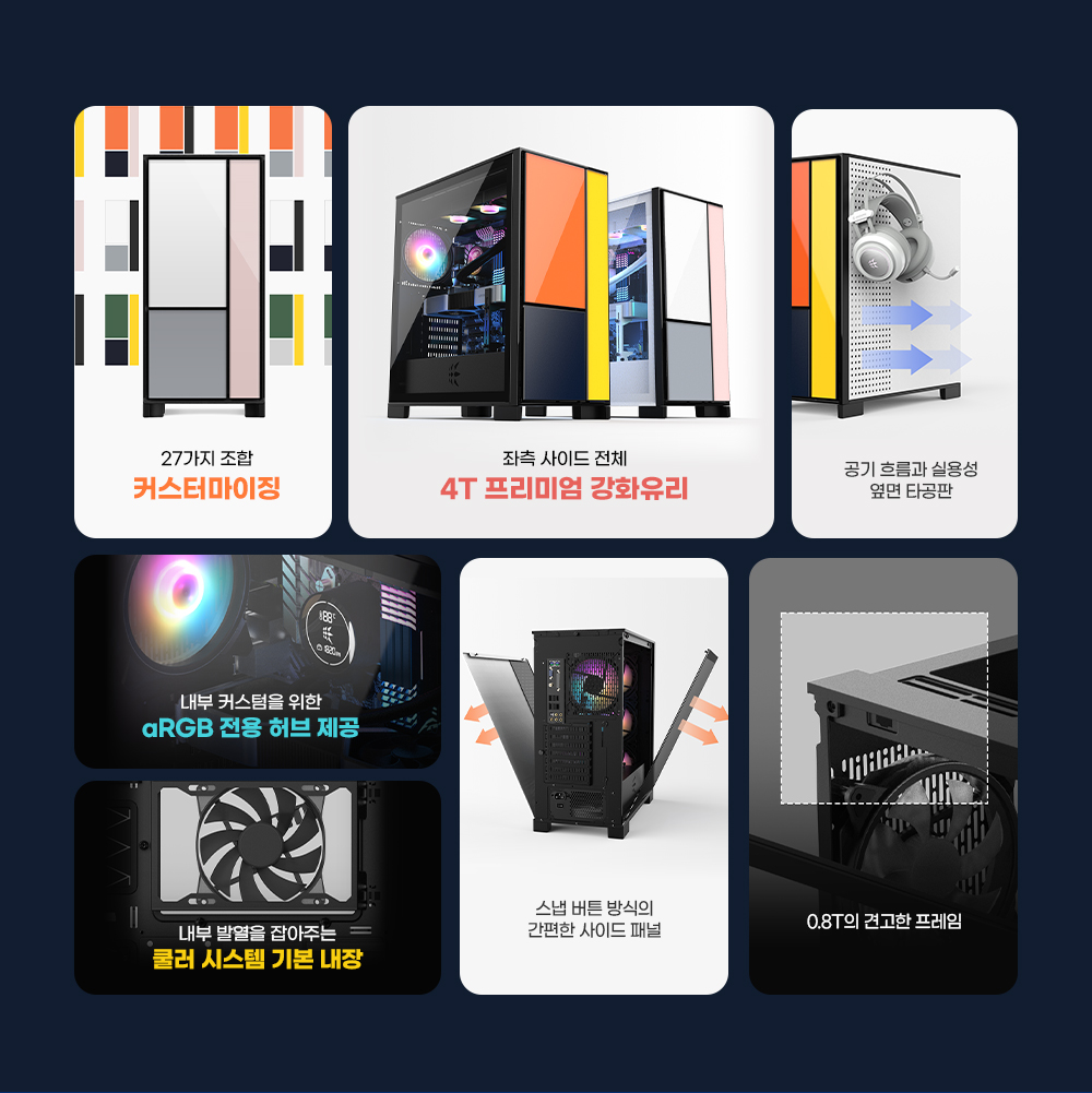 또한, 공기 흐름을 고려한 옆면 타공판과 내부 발열을 효과적으로 제어하는 기본 내장 쿨러 시스템, aRGB 전용 허브 등이 제공되어 실용성과 미적 감각을 모두 만족시킨다. 스냅 버튼 방식의 사이드 패널과 0.8T의 견고한 프레임도 사용자 편의성과 안정성을 높이는 요소다.