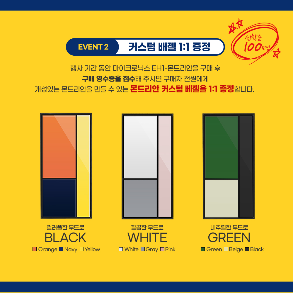 또한, 마이크로닉스는 'EH1-몬드리안' 구매자 전원에게 커스텀 베젤을 1:1로 증정한다. 구매 후 영수증을 접수하면 블랙, 화이트, 그린 중 원하는 색상의 커스텀 베젤을 선택할 수 있다.