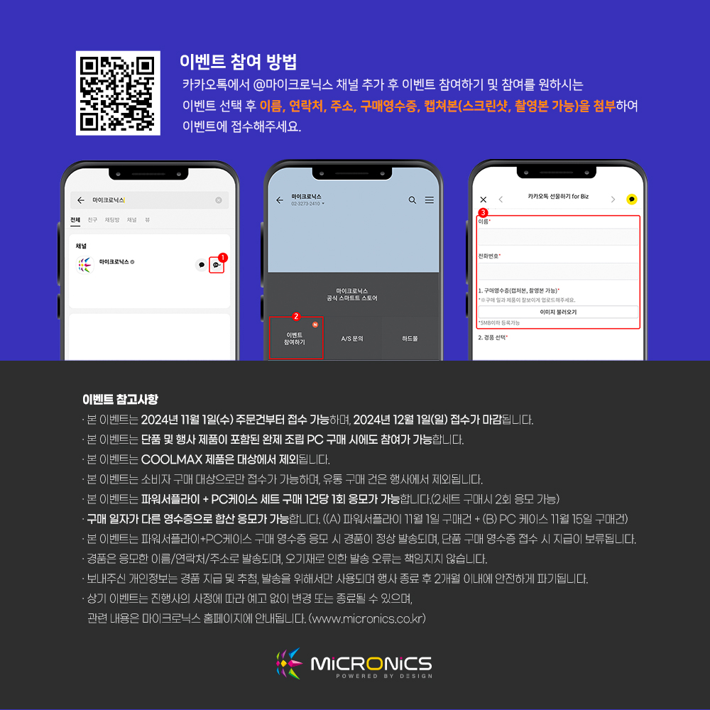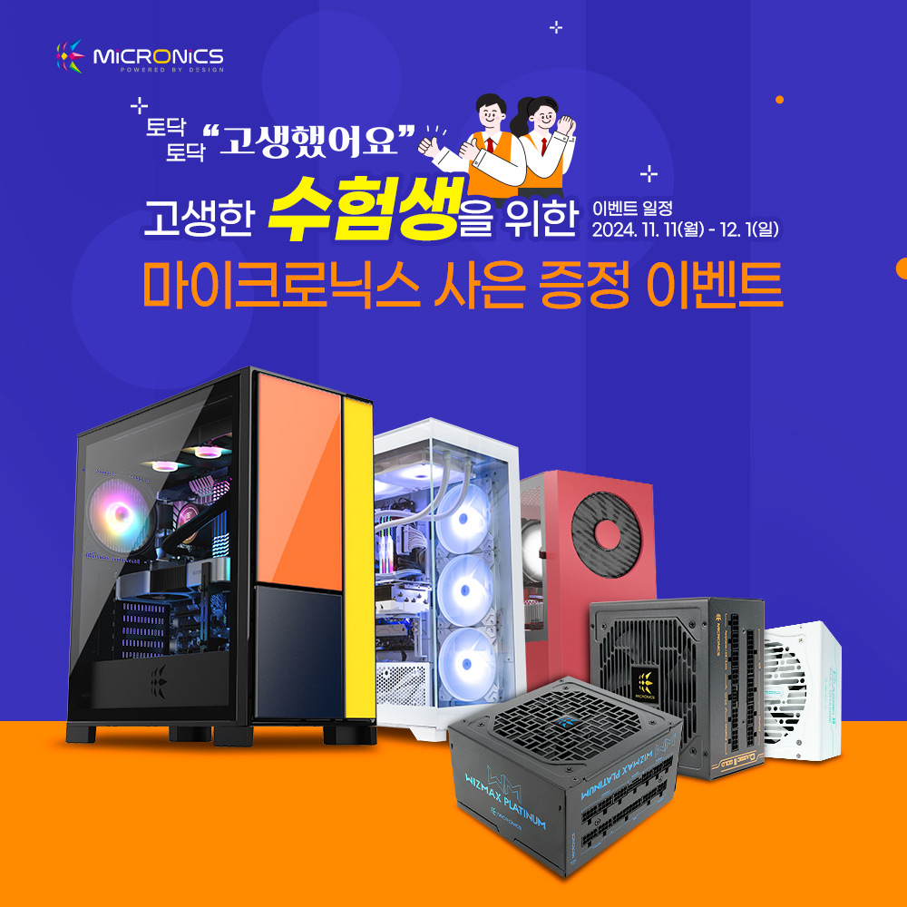 이번 행사는 2024년 11월 11일부터 12월 1일까지 약 3주간 진행되며, 마이크로닉스 파워서플라이와 PC 케이스를 함께 구매(단품 또는 완제PC 포함)한 고객에게 사은품을 제공한다. 행사 대상 제품은 마이크로닉스의 모든 파워서플라이 및 PC 케이스 제품이며, 쿨맥스 브랜드는 제외된다.