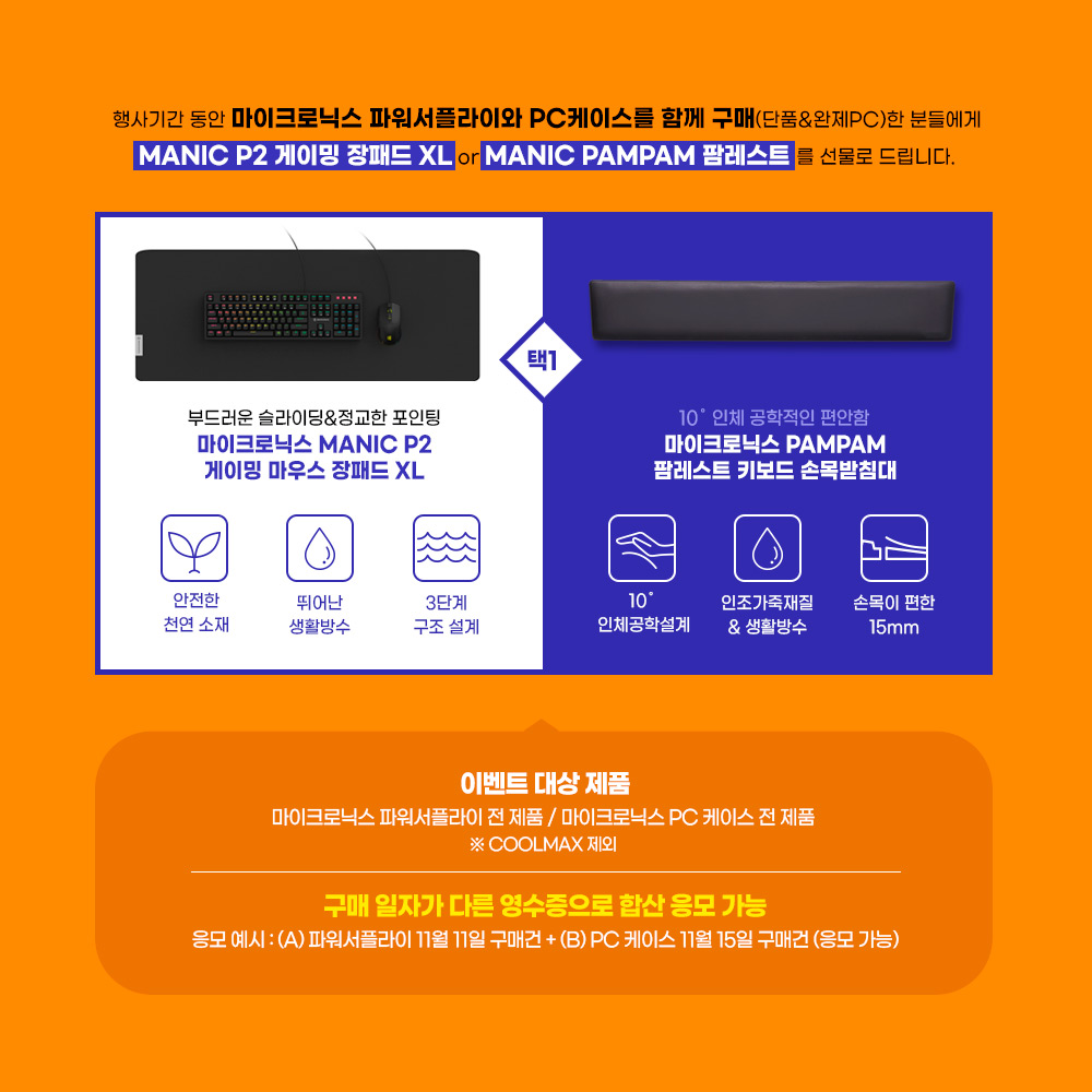 이벤트 참여자는 MANIC P2 게이밍 장패드 XL 또는 MANIC PAMPAM 팜레스트 중 하나를 선택해 받을 수 있다. 구매 일자가 다른 영수증으로도 합산 응모가 가능해 참여의 폭이 넓다. 11월 11일에 파워서플라이를 구매하고, 11월 15일에 PC 케이스를 구매한 경우에도 응모가 가능하다.