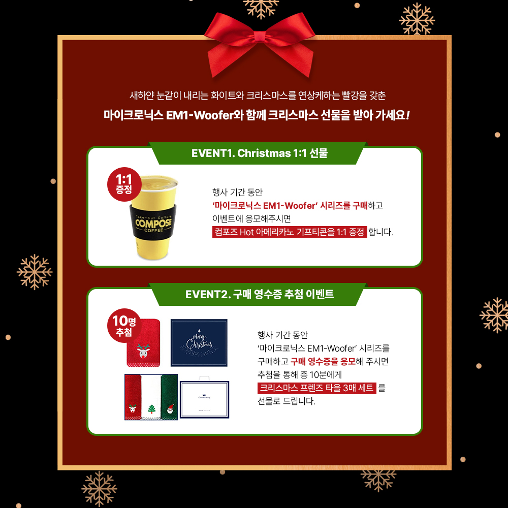 이번 행사는 12월 6일부터 31일까지 진행되며, 행사 기간 동안 EM1-Woofer, EM1-Woofer 시그니처 에디션을 구매한 고객에게 컴포즈 Hot 아메리카노 기프티콘을 1:1 증정한다. 또한, 구매 영수증을 응모한 고객 중 추첨을 통해 **크리스마스 프렌즈 타올 세트(3매)를 추가로 선물한다.