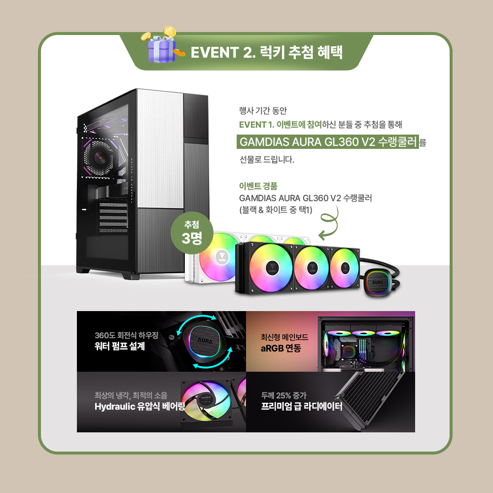 마이크로닉스는 이번 출시를 기념해 1월 14일부터 2월 13일까지 구매자 대상 이벤트를 진행한다. 행사 기간 동안 제품을 구매하고 이벤트에 응모한 고객에게는 선착순으로 모던 라운드 플립 탁상 달력을 증정하며, 추첨을 통해 GAMDIAS AURA GL360 V2 수랭 쿨러를 제공한다.