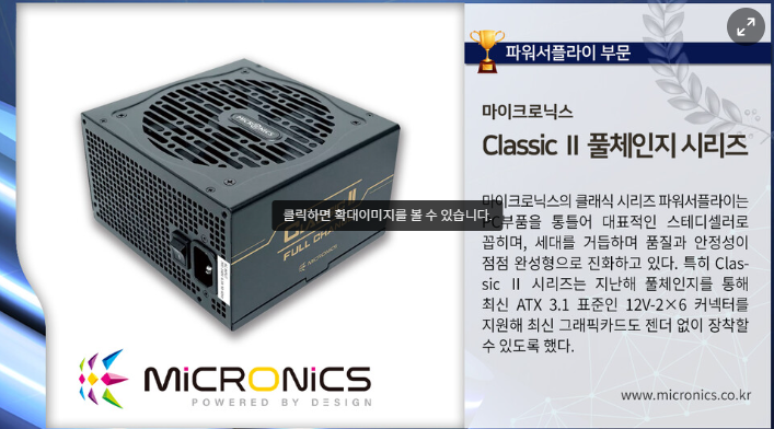 [2025년 2월 7일]게이밍 기기 디자인·개발·제조 전문기업 한미마이크로닉스(대표: 강현민, 이하 마이크로닉스)의 대표 파워서플라이 시리즈 클래식 II 풀체인지가 아이러브PC방이 주관하는 2024 PC방 고객만족 브랜드 파워서플라이 부문에서 수상의 영예를 안았다.