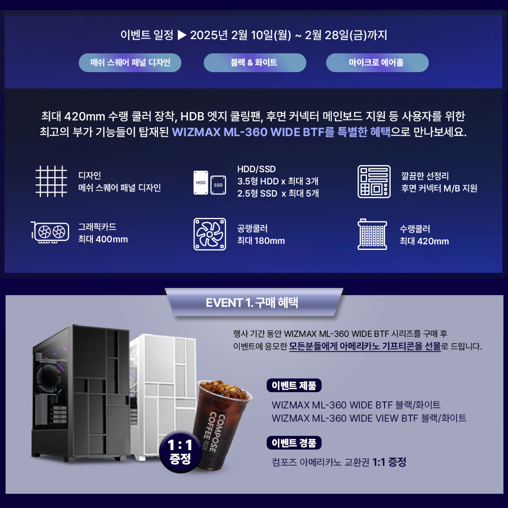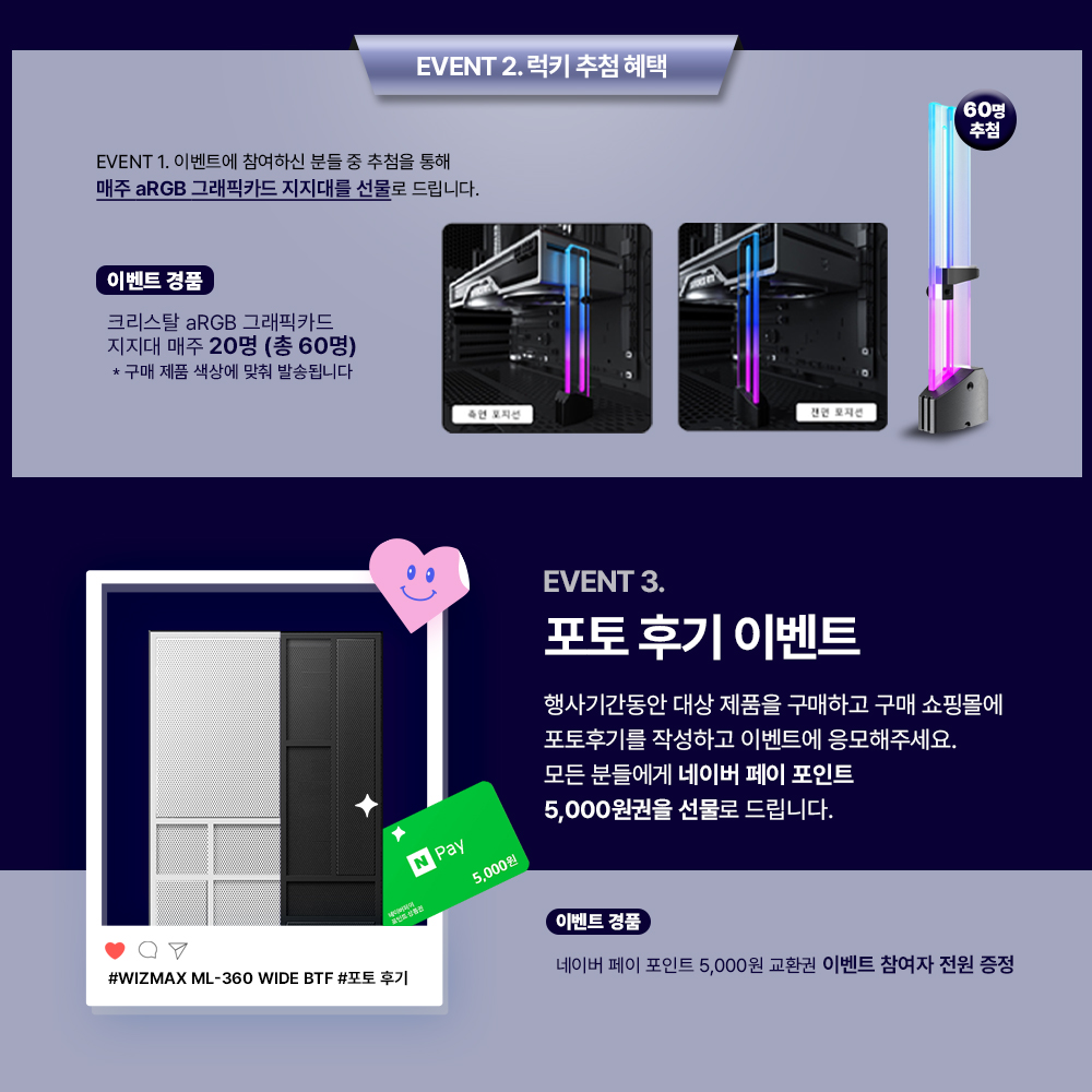 또한, 마이크로닉스는 WIZMAX ML-360 WIDE BTF 출시를 기념해 2025년 2월 10일부터 2월 28일까지 특별 이벤트를 진행한다. 이벤트 기간 동안 제품을 구매한 후 응모하면 컴포즈 아메리카노 기프티콘이 1:1로 증정되며, 응모자 중 매주 20명을 추첨해 크리스탈 aRGB 그래픽카드 지지대(총 60명)를 증정한다. 또한, 포토 후기를 작성하면 네이버페이 포인트 5,000원이 추가 증정된다.