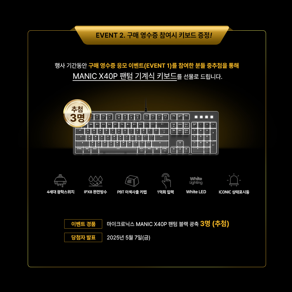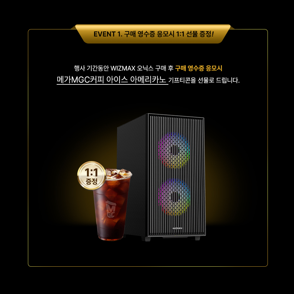 이벤트 기간 동안 제품 구매 후 영수증을 응모하면 메가MGC커피 아이스 아메리카노 교환권이 제공되며, 참여자 중 추첨을 통해 MANIC X40P 팬텀 기계식 키보드(3명)가 추가로 증정된다.