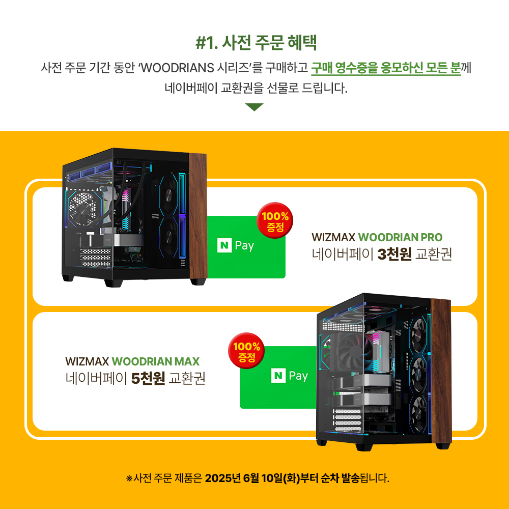 이번 사전주문 행사는 우드리안 PRO 및 우드리안 MAX 모델을 대상으로 진행되며, 구매 후 영수증을 응모한 고객 전원에게 네이버페이 교환권이 증정된다. 모델별로 PRO는 3천원, MAX는 5천원 상당의 교환권이 제공되며, 사전주문 제품은 6월 10일부터 순차 발송될 예정이다.