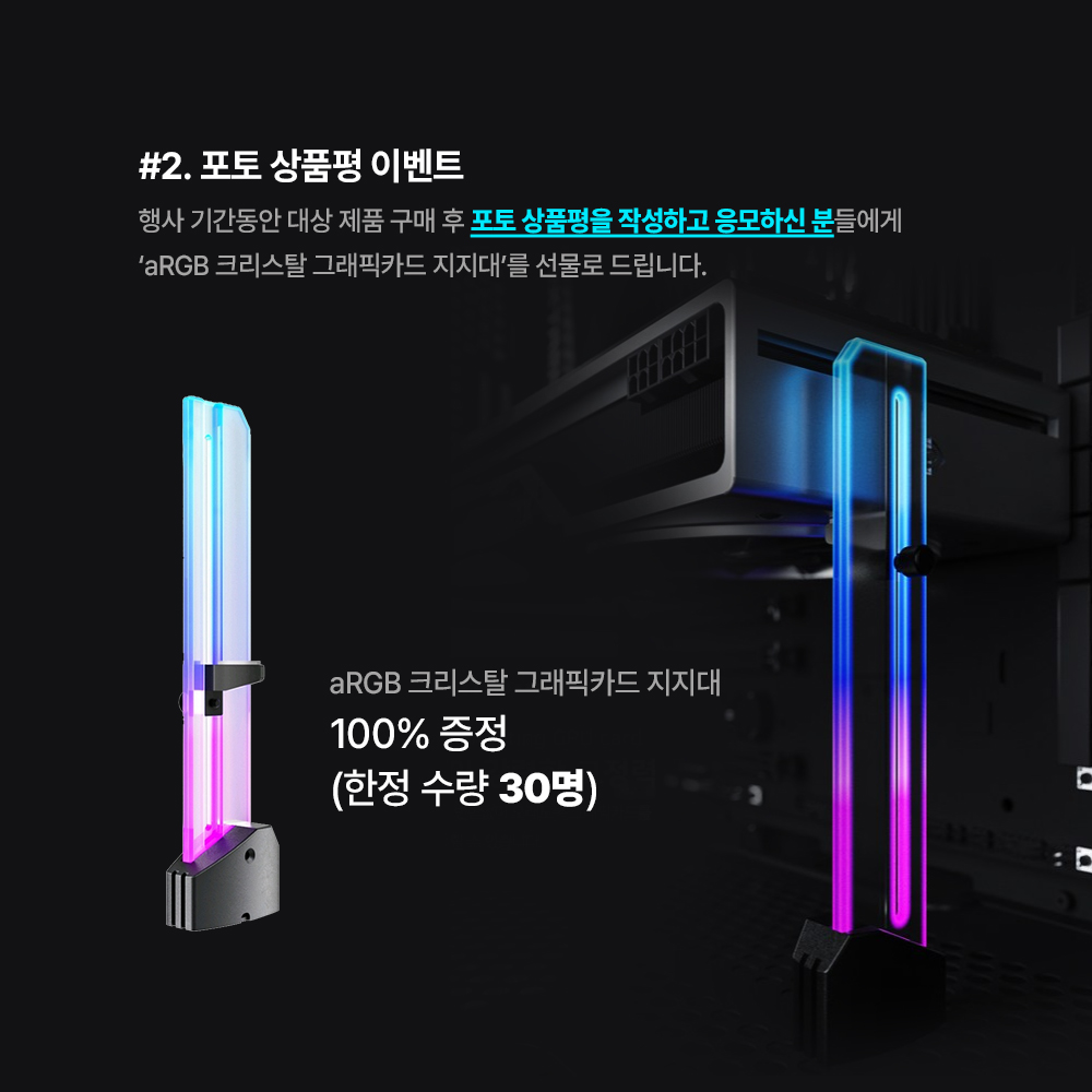 또한, 포토 상품평 이벤트도 함께 진행된다. 제품 수령 후 포토 상품평을 작성하고 응모하면, 한정 수량 30명에게 aRGB 크리스탈 그래픽카드 지지대가 100% 증정된다.
