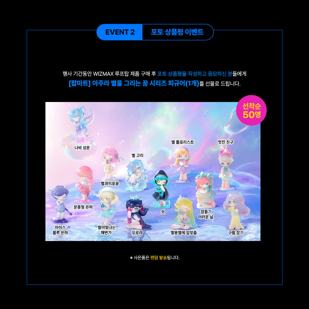 한편, 마이크로닉스는 WIZMAX 루프탑 출시를 기념해 다양한 사은 이벤트를 진행한다. 제품 구매 후 영수증을 인증하면 디지털 게임 플랫폼 ‘스팀(Steam)’에서 사용 가능한 2만 5천 원 상당의 스팀 월렛 교환권이 증정된다. 또한 제품 구매 후 포토 상품평을 작성하고 응모한 고객 중 선착순 50명에게는 팝마트(Pop Mart)의 ‘아주라: 별을 그리는 꿈’ 시리즈 피규어 1개를 추가로 증정한다.