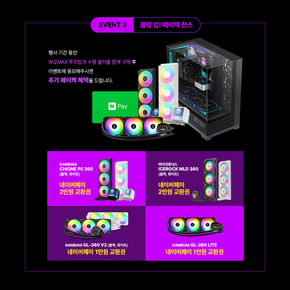 이와 함께, WIZMAX 루프탑과 수랭 쿨러를 함께 구매한 고객에게는 제품에 따라 네이버페이 교환권을 제공하는 추가 페이백 혜택도 마련됐다. ‘GAMDIAS CHIONE P5 360’과 ‘마이크로닉스 ICEROCK MLD 360’ 구매 시에는 각각 2만 원 상당의 네이버페이 교환권이 제공되며, ‘GAMDIAS GL-360 V2’와 ‘GAMDIAS GL-360 LITE’ 제품 구매 시에는 각각 1만 원의 네이버페이 교환권이 증정된다.