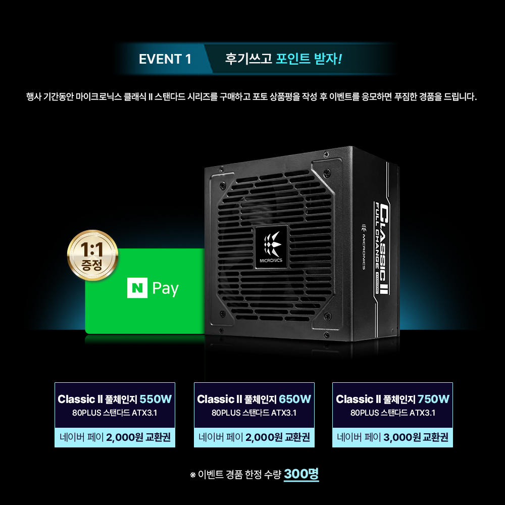 증정되는 경품은 제품 용량에 따라 다르게 구성된다. ‘클래식 II 풀체인지 550W 80PLUS 스탠다드 ATX 3.1’과 ‘클래식 II 풀체인지 650W 80PLUS 스탠다드 ATX 3.1’ 모델을 구매한 고객에게는 각각 네이버페이 2,000원 교환권이 제공되며, ‘클래식 II 풀체인지 750W 80PLUS 스탠다드 ATX 3.1’ 모델의 경우 네이버페이 3,000원 교환권이 증정된다. 해당 포토 상품평 이벤트는 총 300명 한정으로 운영되며, 선착순 마감될 수 있다.