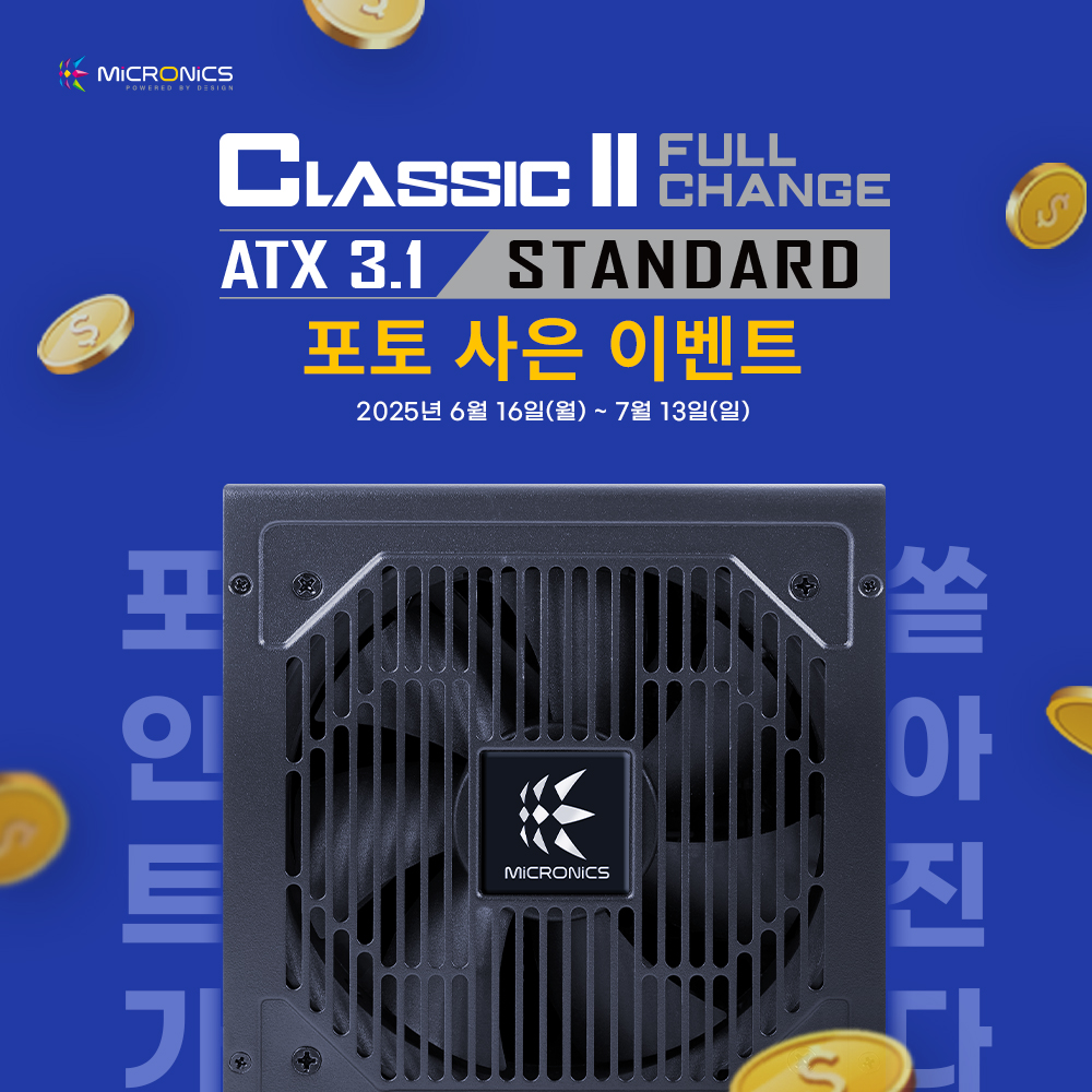 [2025년 6월 16일] 게이밍 기기 디자인·개발·제조 전문기업 한미마이크로닉스(대표: 강현민, 이하 마이크로닉스)가 ATX 3.1 규격을 지원하는 파워서플라이 ‘클래식 II 풀체인지 스탠다드 ATX 3.1’ 시리즈를 대상으로 포토 사은 이벤트를 진행한다.