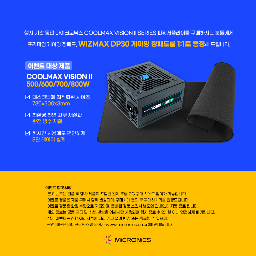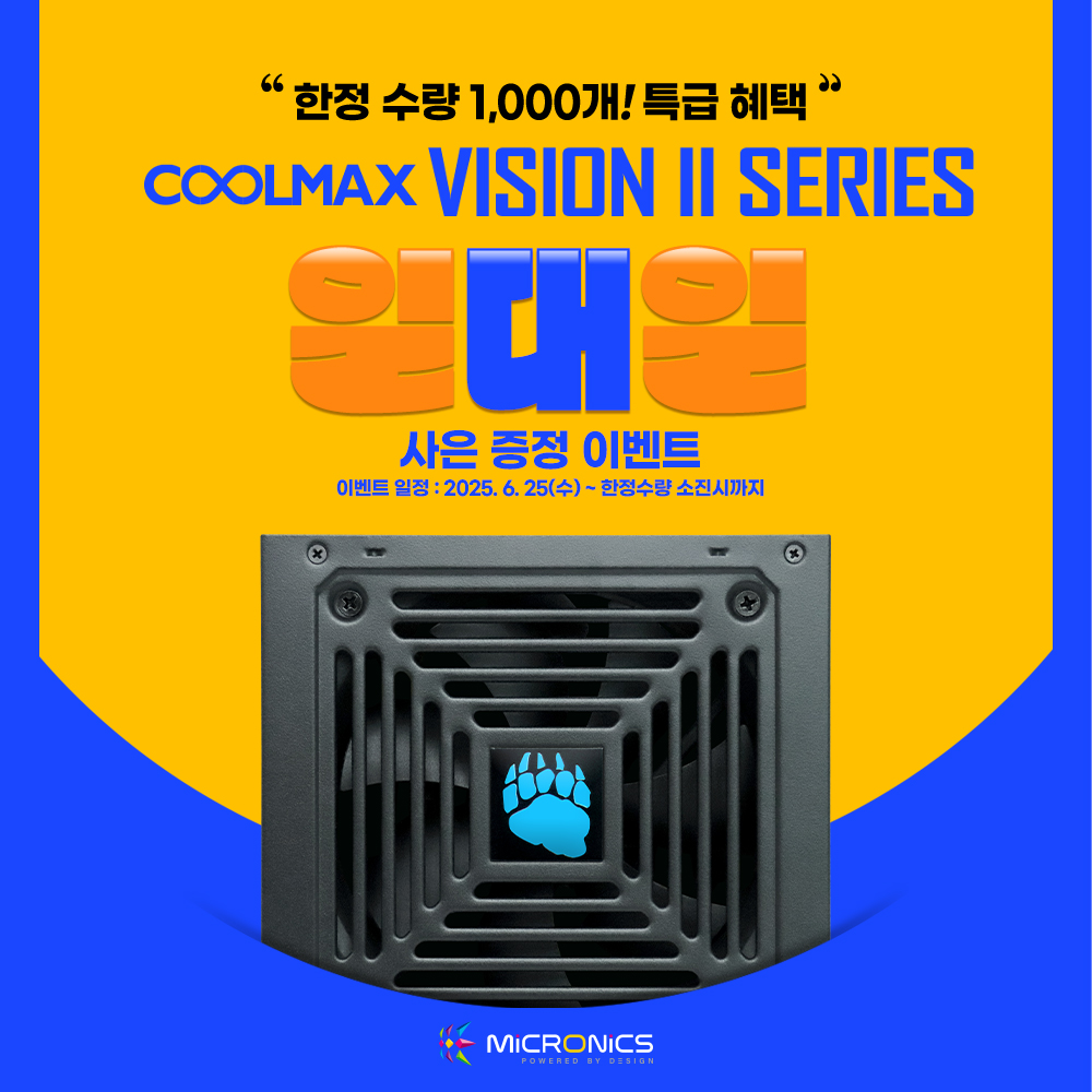 [2025년 6월 25일] 게이밍 기기 디자인·개발·제조 전문기업 한미마이크로닉스(대표: 강현민, 이하 마이크로닉스)가 자사의 파워서플라이 ‘COOLMAX VISION II’ 구매자를 대상으로 사은 증정 이벤트를 진행한다.