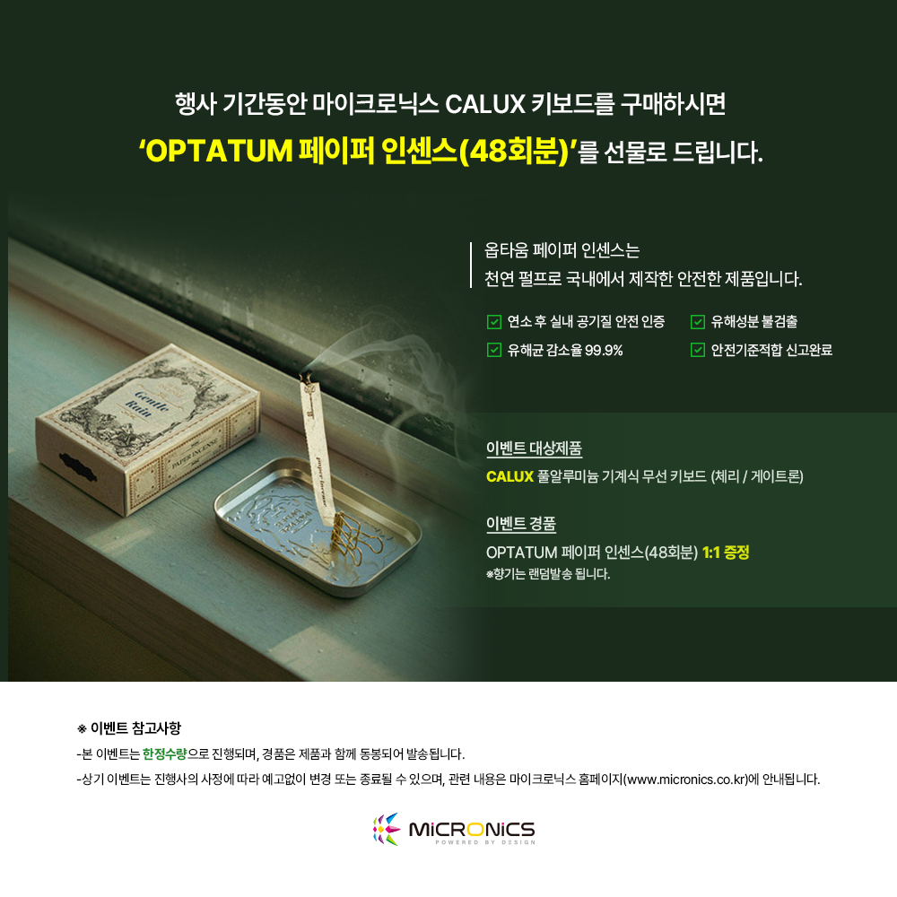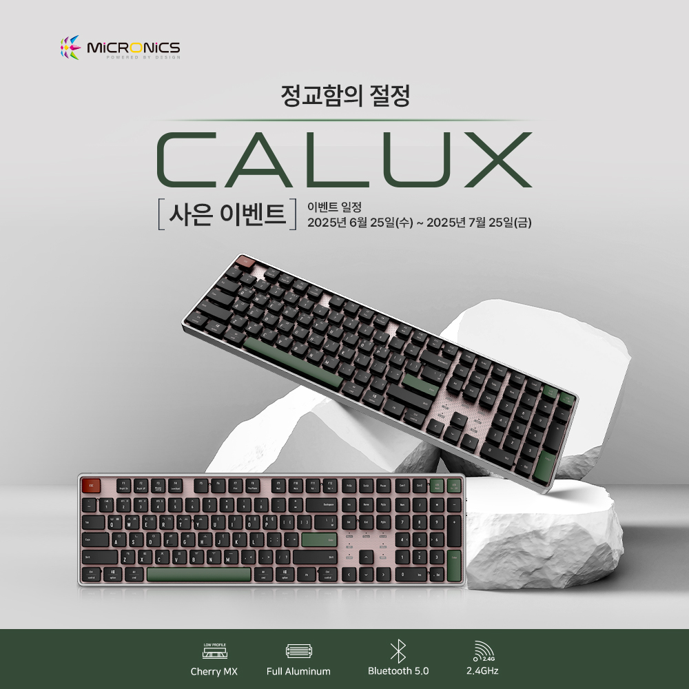 [2025년 6월 25일] 게이밍 기기 디자인·개발·제조 전문기업 한미마이크로닉스(대표: 강현민, 이하 마이크로닉스)는 프리미엄 키보드 Calux(이하 칼럭스) 구매 고객을 대상으로 사은품 증정 이벤트를 6월 25일부터 7월 25일까지 진행한다고 밝혔다.